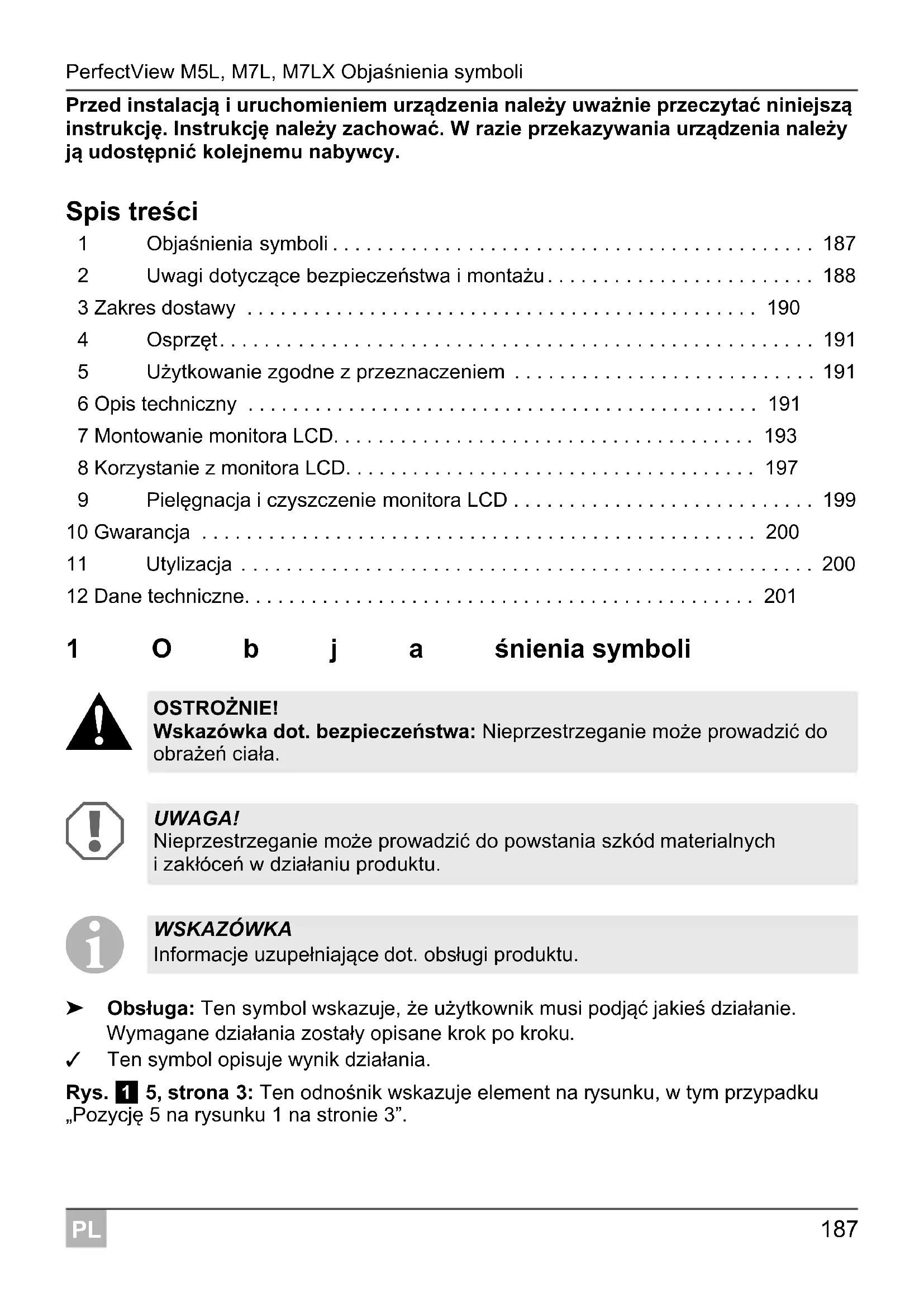 ➤ Obsługa: Ten symbol wskazuje, że użytkownik musi podjąć jakieś działanie. Wymagane działania zostały opisane krok po kroku. ✓ Ten symbol opisuje wynik działania. Rys. 1 5, strona 3: Ten odnośnik wskazuje element na rysunku, w tym przypadku „Pozycję 5 na rysunku 1 na stronie 3”. OSTROŻNIE! Wskazówka dot. bezpieczeństwa: Nieprzestrzeganie może prowadzić do obrażeń ciała. UWAGA! Nieprzestrzeganie może prowadzić do powstania szkód materialnych izakłóceń w działaniu produktu. WSKAZÓWKA Informacje uzupełniające dot. obsługi produktu.Uwagi dotyczące bezpieczeństwa i montażu PerfectView M5L, M7L, M7LX
