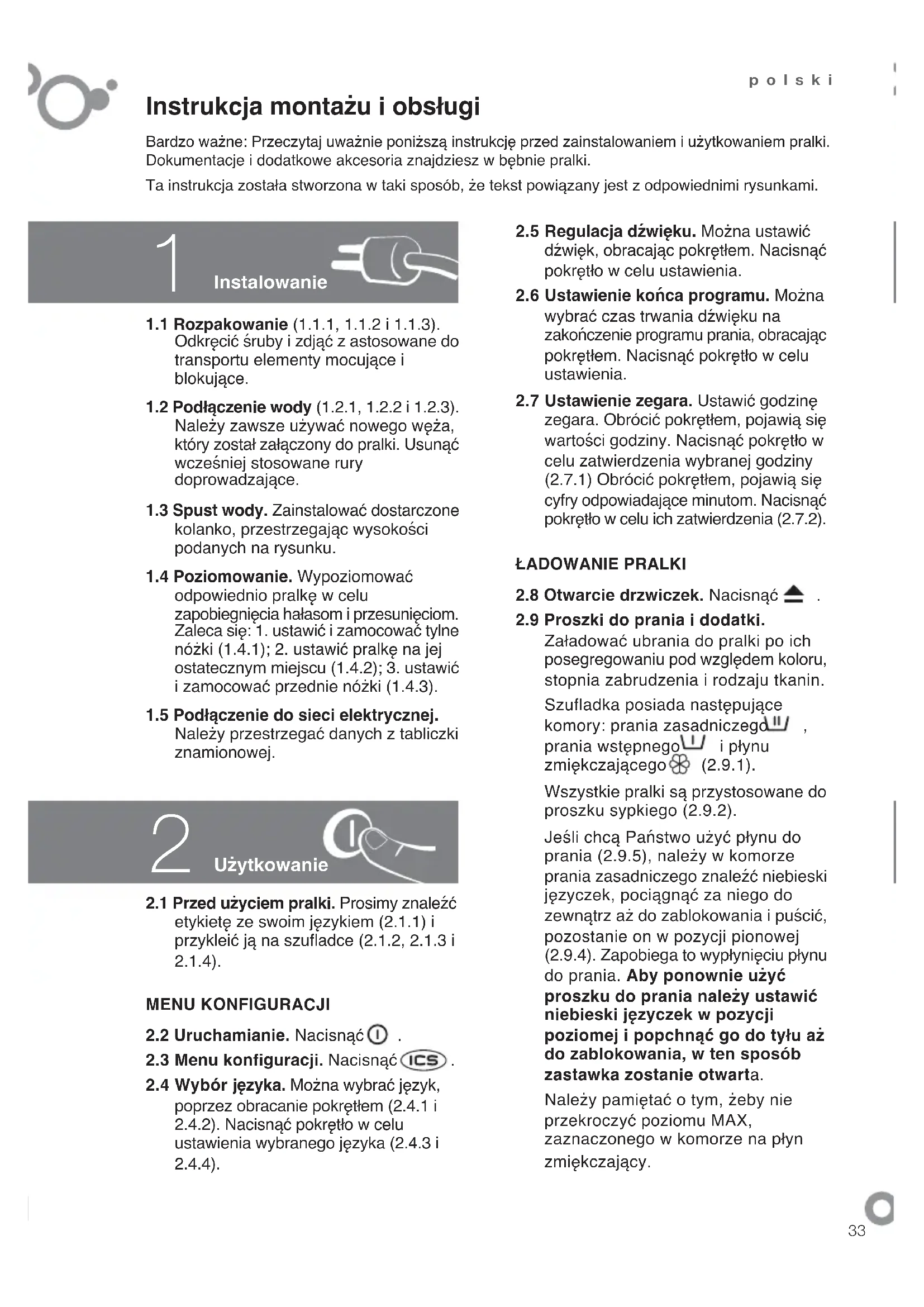 Załadować ubrania do pralki po ich posegregowaniu pod względem koloru, stopnia zabrudzenia i rodzaju tkanin. Szufladka posiada następujące komory: prania zasadniczego , prania wstępnego i płynu zmiękczającego (2.9.1). Wszystkie pralki są przystosowane do proszku sypkiego (2.9.2). Jeśli chcą Państwo użyć płynu do prania (2.9.5), należy w komorze prania zasadniczego znaleźć niebieski języczek, pociągnąć za niego do zewnątrz aż do zablokowania i puścić, pozostanie on w pozycji pionowej (2.9.4). Zapobiega to wypłynięciu płynu do prania. Aby ponownie użyć proszku do prania należy ustawić niebieski języczek w pozycji poziomej i popchnąć go do tyłu aż do zablokowania, w ten sposób zastawka zostanie otwarta. Należy pamiętać o tym, żeby nie przekroczyć poziomu MAX, zaznaczonego w komorze na płyn zmiękczający. Bardzo ważne: Przeczytaj uważnie poniższą instrukcję przed zainstalowaniem i użytkowaniem pralki. Dokumentacje i dodatkowe akcesoria znajdziesz w bębnie pralki. Ta instrukcja została stworzona w taki sposób, że tekst powiązany jest z odpowiednimi rysunkami.