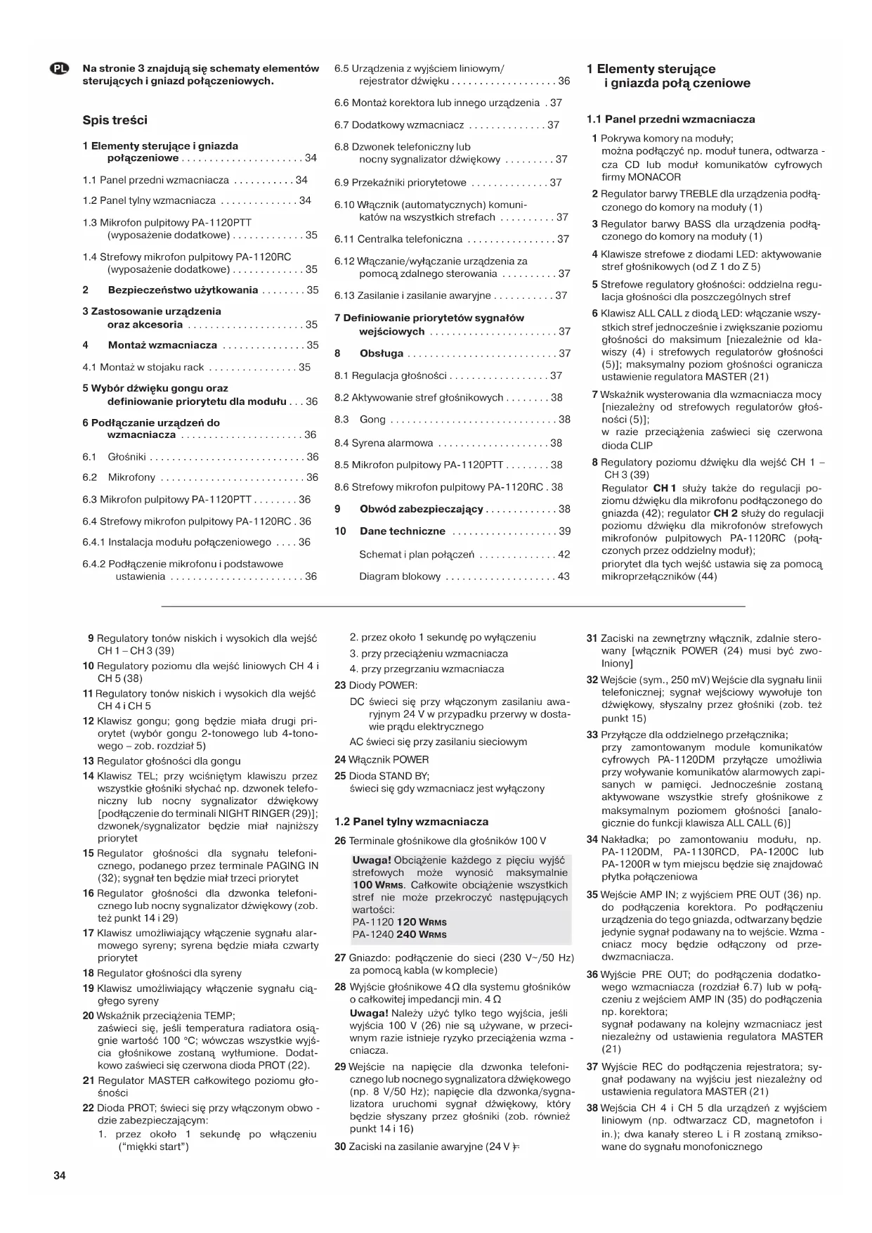 1 Pokrywa komory na moduły; można podłączyć np. moduł tunera, odtwarza - cza CD lub moduł komunikatów cyfrowych firmy MONACOR 2 Regulator barwy TREBLE dla urządzenia podłą - czonego do komory na moduły (1) 3 Regulator barwy BASS dla urządzenia podłą - czonego do komory na moduły (1) 4 Klawisze strefowe z diodami LED: aktywowanie stref głośnikowych (od Z 1 do Z 5) 5 Strefowe regulatory głośności: oddzielna regu- lacja głośności dla poszczególnych stref 6 Klawisz ALL CALL z diodą LED: włączanie wszy- stkich stref jednocześnie i zwiększanie poziomu głośności do maksimum [niezależnie od kla- wiszy (4) i strefowych regulatorów głośności (5)]; maksymalny poziom głośności ogranicza ustawienie regulatora MASTER (21) 7 Wskaźnik wysterowania dla wzmacniacza mocy [niezależny od strefowych regulatorów głoś- ności (5)]; w razie przeciążenia zaświeci się czerwona dioda CLIP 8 Regulatory poziomu dźwięku dla wejść CH 1 – CH 3 (39) Regulator CH 1 służy także do regulacji po - ziomu dźwięku dla mikrofonu podłączonego do gniazda (42); regulator CH 2 służy do regulacji poziomu dźwięku dla mikrofonów strefowych mikrofonów pulpitowych PA-1120RC (połą - czonych przez oddzielny moduł); priorytet dla tych wejść ustawia się za pomocą mikroprzełączników (44) 9 Regulatory tonów niskich i wysokich dla wejść CH1–CH3 (39) 10 Regulatory poziomu dla wejść liniowych CH 4 i CH 5 (38) 11 Regulatory tonów niskich i wysokich dla wejść CH 4 i CH 5 12 Klawisz gongu; gong będzie miała drugi pri- orytet (wybór gongu 2-tonowego lub 4-tono- wego – zob. rozdział 5) 13 Regulator głośności dla gongu 14 Klawisz TEL; przy wciśniętym klawiszu przez wszystkie głośniki słychać np. dzwonek telefo- niczny lub nocny sygnalizator dźwiękowy [podłączenie do terminali NIGHT RINGER (29)]; dzwonek/sygnalizator będzie miał najniższy priorytet 15 Regulator głośności dla sygnału telefoni - cznego, podanego przez terminale PAGING IN (32); sygnał ten będzie miał trzeci priorytet 16 Regulator głośności dla dzwonka telefoni - cznego lub nocny sygnalizator dźwiękowy (zob. też punkt 14 i 29) 17 Klawisz umożliwiający włączenie sygnału alar - mo wego syreny; syrena będzie miała czwarty priorytet 18 Regulator głośności dla syreny 19 Klawisz umożliwiający włączenie sygnału cią - głego syreny 20 Wskaźnik przeciążenia TEMP; zaświeci się, jeśli temperatura radiatora osią - gnie wartość 100 °C; wówczas wszystkie wyjś- cia głośnikowe zostaną wytłumione. Dodat- kowo zaświeci się czerwona dioda PROT (22). 21 Regulator MASTER całkowitego poziomu gło - śności 22 Dioda PROT; świeci się przy włączonym obwo - dzie zabezpieczającym: