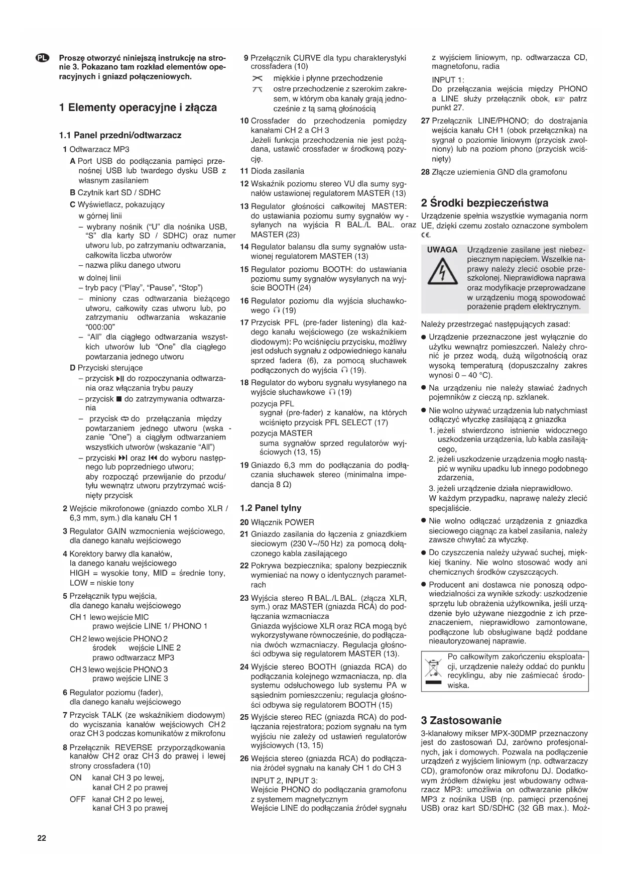 3-klanałowy mikser MPX-30DMP przeznaczony jest do zastosowań DJ, zarówno profesionalnych, jak i domowych. Pozwala na podłączenie urządzeń z wyjściem liniowym (np. odtwarzaczy CD), gramofonów oraz mikrofonu DJ. Dodatkowym źródłem dźwięku jest wbudowany odtwarzacz MP3: umożliwia on odtwarzanie plików MP3 z nośnika USB (np. pamięci przenośnej USB) oraz kart SD/SDHC (32 GB max.). Moż-