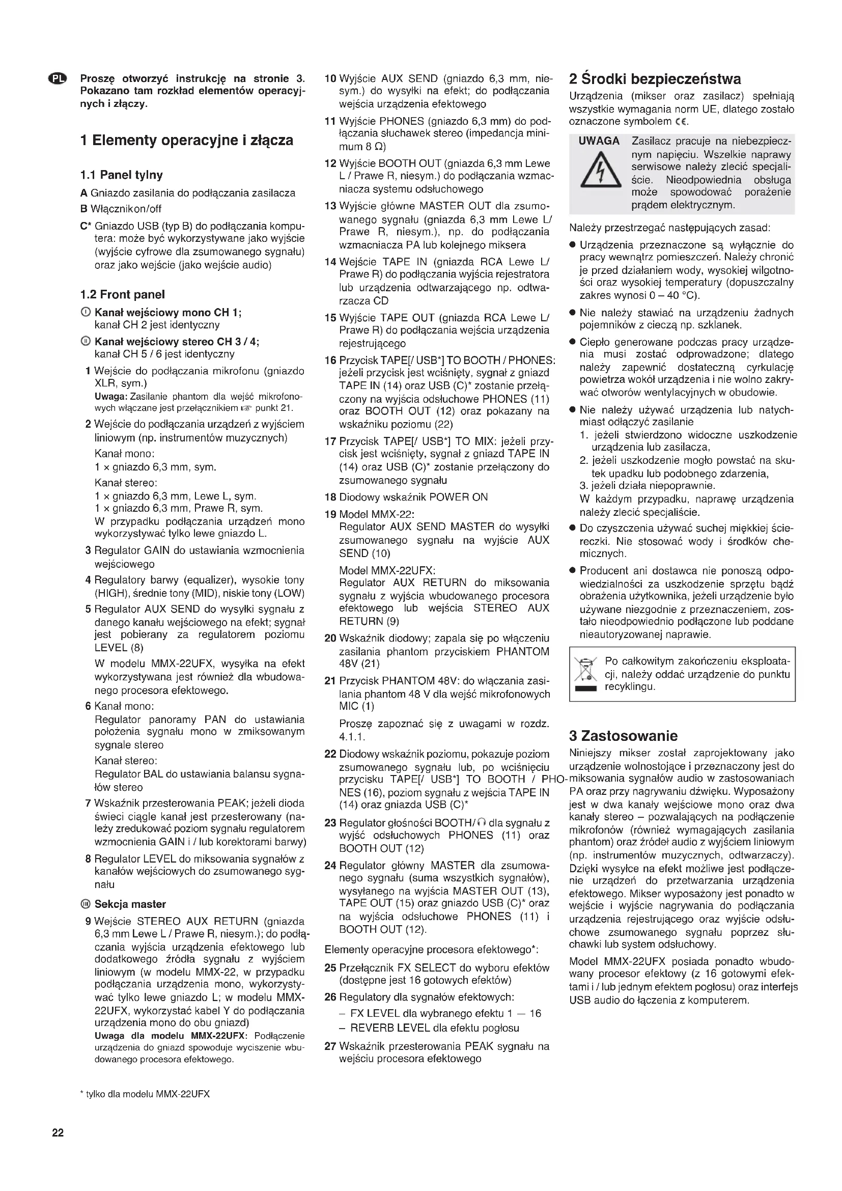 Model MMX-22UFX posiada ponadto wbudowany procesor efektowy (z 16 gotowymi efektami i / lub jednym efektem pogłosu) oraz interfejs USB audio do łączenia z komputerem.
