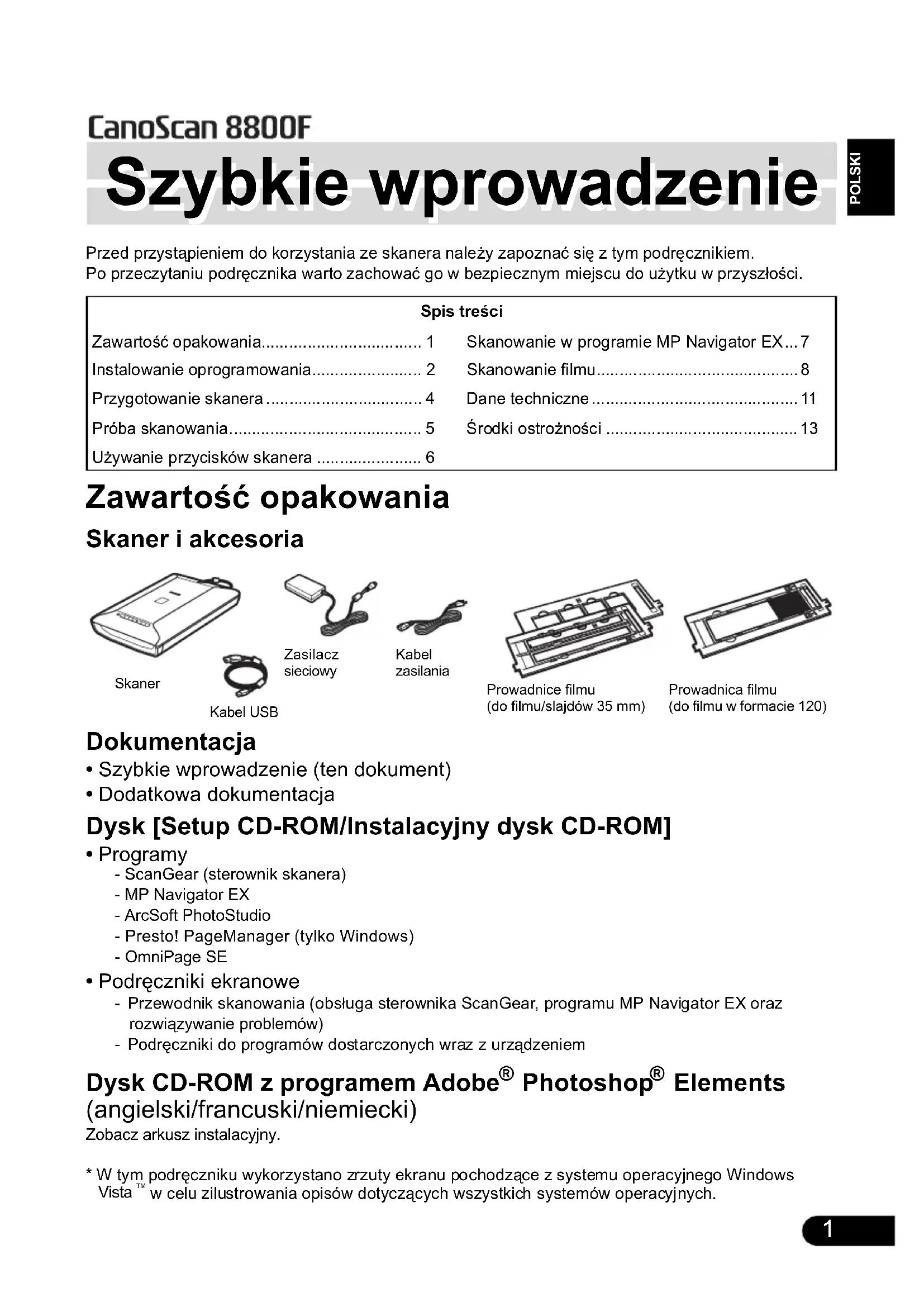 - Używanie przycisków skanera Szybkie wprowadzenie Szybkie wprowadzenie SkanerKabel USBProwadnice filmu(do filmu/slajdów 35 mm)Zasilacz sieciowyProwadnica filmu(do filmu w formacie 120)Kabel zasilaniaInstalowanie oprogramowania p. 6