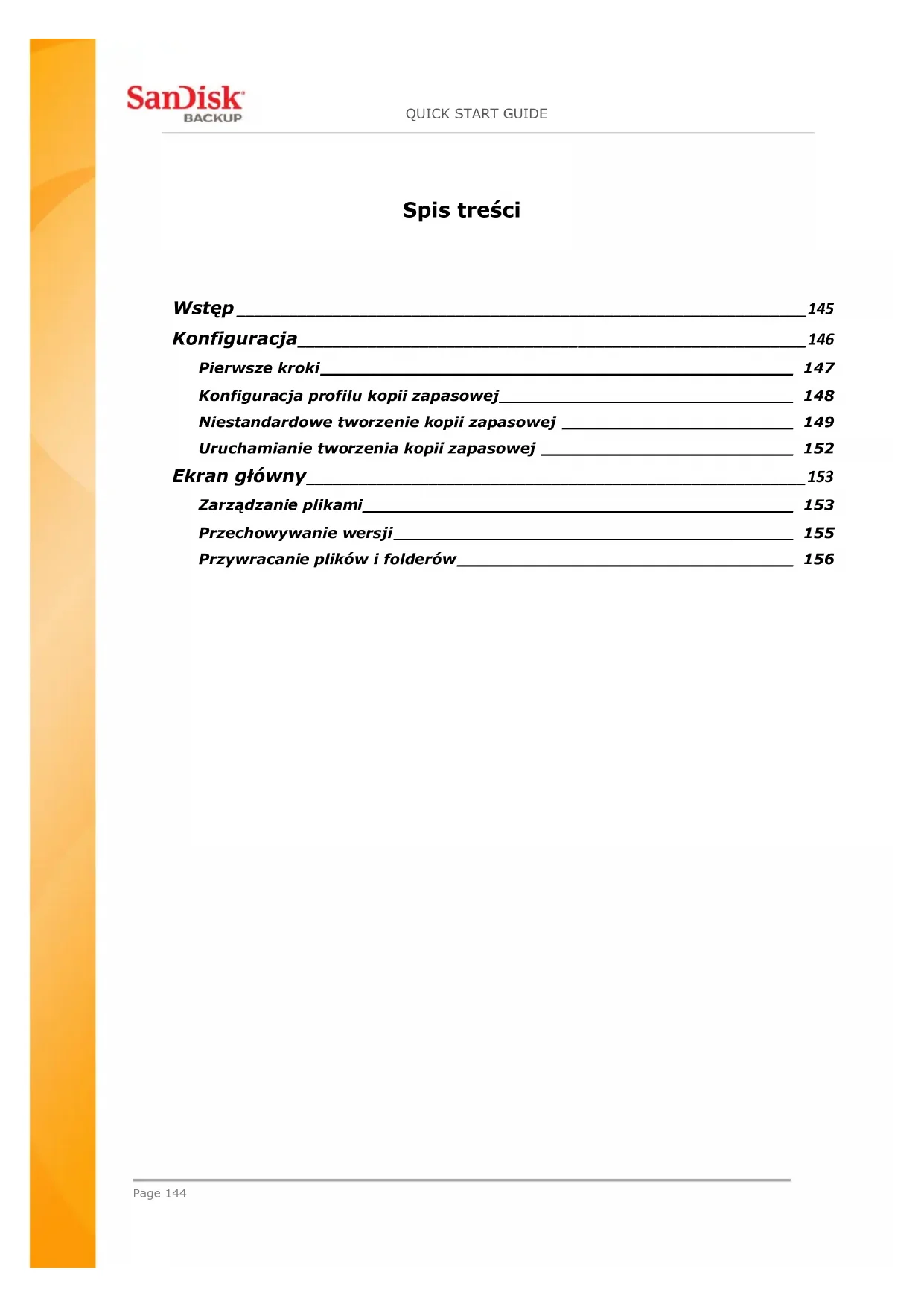 Wstęp _________________________________________________________________ 145 Konfiguracja __________________________________________________________ 146 Pierwsze kroki _____________________________________________ 147 Konfiguracja profilu kopii zapasowej ____________________________ 148 Niestandardowe tworzenie kopii zapasowej ______________________ 149 Uruchamianie tworzenia kopii zapasowej ________________________ 152 Ekran główny _________________________________________________________ 153 Zarządzanie plikami _________________________________________ 153 Przechowywanie wersji ______________________________________ 155 Przywracanie plików i folderów ________________________________ 156QUICK START GUIDE