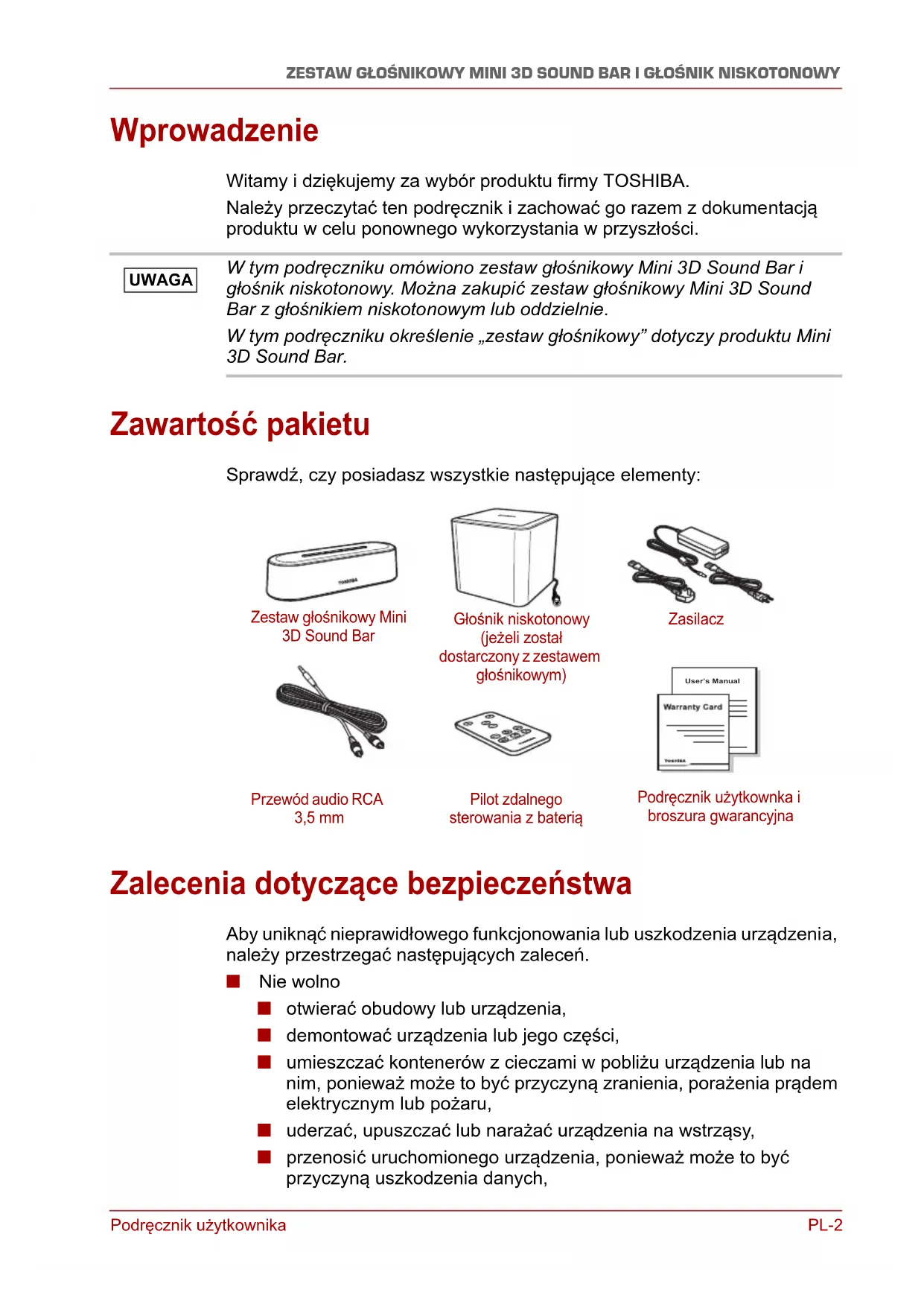 (SBW10)Podręcznik użytkownika PL-2 ZESTAW GŁOŚNIKOWY MINI 3D SOUND BAR I GŁOŚNIK NISKOTONOWY Wprowadzenie Witamy i dziękujemy za wybór produktu firmy TOSHIBA. Należy przeczytać ten podręcznik i zachować go razem z dokumentacją produktu w celu ponownego wykorzystania w przyszłości. Zawartość pakietu Sprawdź, czy posiadasz wszystkie następujące elementy: Zalecenia dotyczące bezpieczeństwa Aby uniknąć nieprawidłowego funkcjonowania lub uszkodzenia urządzenia, należy przestrzegać następujących zaleceń. ■ Nie wolno ■ otwierać obudowy lub urządzenia, ■ demontować urządzenia lub jego części, ■ umieszczać kontenerów z cieczami w pobliżu urządzenia lub na nim, ponieważ może to być przyczyną zranienia, porażenia prądem elektrycznym lub pożaru, ■ uderzać, upuszczać lub narażać urządzenia na wstrząsy, ■ przenosić uruchomionego urządzenia, ponieważ może to być przyczyną uszkodzenia danych, W tym podręczniku omówiono zestaw głośnikowy Mini 3D Sound Bar i głośnik niskotonowy. Można zakupi ć zestaw głośnikowy Mini 3D Sound Bar z głośnikiem niskotonowym lub oddzielnie. W tym podręczniku określenie „zestaw głośnikowy” dotyczy produktu Mini 3D Sound Bar. UWAGA User’s Manual Zestaw głośnikowy Mini 3D Sound Bar Głośnik niskotonowy (jeżeli został dostarczony z zestawem głośnikowym) Zasilacz Przewód audio RCA 3,5 mm Pilot zdalnego sterowania z baterią Podręcznik użytkownka i broszura gwarancyjnaPL-3 Podręcznik użytkownika ZESTAW GŁOŚNIKOWY MINI 3D SOUND BAR I GŁOŚNIK NISKOTONOWY ■ używać zasilaczy AC/DC innych niż dostarczone z tym urządzeniem, ponieważ może to być przyczyną uszkodzenia urządzenia, ■ odłączać przewodów wówczas, gdy urządzenie jest uruchomione, ■ narażać produktu na temperatury poza zakresem 5°C–35°C (po uruchomieniu) i –20°C–60°C (po wyłączeniu), ■ narażać urządzenia na oddziaływanie wilgoci, ■ przykrywać urządzenia wówczas, gdy jest uruchomione, ponieważ może to być przyczyną przegrzania, ■ umieszczać urządzenia w pobliżu źródeł ciepła, ■ wrzucać baterii pilota zdalnego sterowania (dostarczonego z zestawem głośnikowym Mini 3D Sound Bar) do ognia, ponieważ może to być przyczyną eksplodowania baterii, ■ pozostawiać baterii pilota zdalnego sterowania w miejscu dost ępnym dla dzieci, ponieważ ogniwa baterii mogą zostać połknięte przez dzieci. ■ Należy natychmiast odłączyć urządzenie w następujących okolicznościach: ■ dym lub nietypowy zapach w pobliżu obudowy urządzenia, ■ przedostanie się wody do wnętrza urządzenia lub zawilgocenie obudowy, ■ przedostanie się jakiegokolwiek przedmiotu do wnętrza urządzenia, ■ uszkodzenie przewodu (należy wymienić przewód na nowy). ■ Zestaw głośnikowy Mini 3D Sound Bar zawiera magnesy głośników. Magnesy mogą spowodować usunięcie danych z magnetycznych nośników magazynujących, takich jak taśmy wideo, dyski twarde i karty kredytowe. Należy więc umieścić zestaw głośnikowy z dala od tych przedmiotów. W przypadku nieprawidłowego funkcjonowania urzą dzenia lub wątpliwości dotyczących zagrożeń elektrycznych należy niezwłocznie skorzystać z infolinii TOSHIBA lub skontaktować się z autoryzowanym sprzedawcą. Opis urządzenia W tej sekcji omówiono elementy zestawu głośnikowego Mini 3D Sound Bar i głośnika niskotonowego. Opisy poszczególnych elementów zamieszczono w tabelach poniżej ilustracji. Zależnie od zakupionego produktu dostępny może być zestaw głośnikowy Mini 3D Sound Bar i/lub głośnik niskotonowy. UWAGAPodręcznik użytkownika PL-4 ZESTAW GŁOŚNIKOWY MINI 3D SOUND BAR I GŁOŚNIK NISKOTONOWY Zestaw głośnikowy Mini 3D Sound Bar Widok z przodu (Ilustracja przykładowa) Widok zestawu głośnikowego Mini 3D Sound Bar z przodu Lp Element Opis 1WEJŚCIE Wybór źródła zgodnie z sekwencją Aux-in (Dodatkowy), Line-in (Liniowy), Optical (Optyczny), Coaxial (Koncentryczny) i ponownie Aux-in. Zestaw głośnikowy dom yślnie obsługuje sygnał z wejścia Aux-in (Dodatkowy).