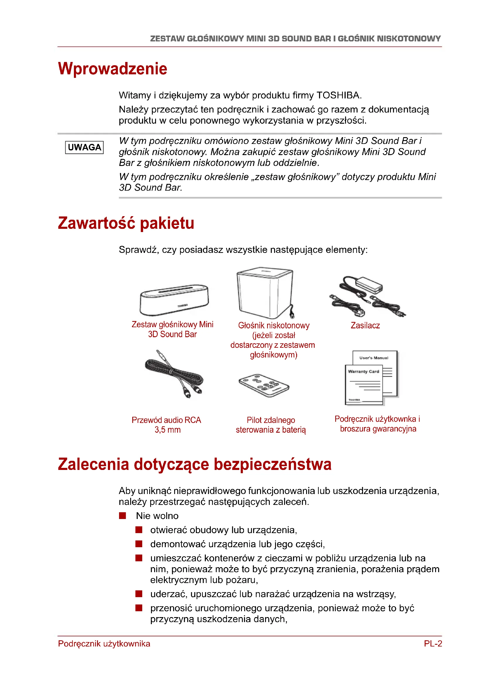 (SBW10)Podręcznik użytkownika PL-2 ZESTAW GŁOŚNIKOWY MINI 3D SOUND BAR I GŁOŚNIK NISKOTONOWY Wprowadzenie Witamy i dziękujemy za wybór produktu firmy TOSHIBA. Należy przeczytać ten podręcznik i zachować go razem z dokumentacją produktu w celu ponownego wykorzystania w przyszłości. Zawartość pakietu Sprawdź, czy posiadasz wszystkie następujące elementy: Zalecenia dotyczące bezpieczeństwa Aby uniknąć nieprawidłowego funkcjonowania lub uszkodzenia urządzenia, należy przestrzegać następujących zaleceń. ■ Nie wolno ■ otwierać obudowy lub urządzenia, ■ demontować urządzenia lub jego części, ■ umieszczać kontenerów z cieczami w pobliżu urządzenia lub na nim, ponieważ może to być przyczyną zranienia, porażenia prądem elektrycznym lub pożaru, ■ uderzać, upuszczać lub narażać urządzenia na wstrząsy, ■ przenosić uruchomionego urządzenia, ponieważ może to być przyczyną uszkodzenia danych, W tym podręczniku omówiono zestaw głośnikowy Mini 3D Sound Bar i głośnik niskotonowy. Można zakupi ć zestaw głośnikowy Mini 3D Sound Bar z głośnikiem niskotonowym lub oddzielnie. W tym podręczniku określenie „zestaw głośnikowy” dotyczy produktu Mini 3D Sound Bar. UWAGA User’s Manual Zestaw głośnikowy Mini 3D Sound Bar Głośnik niskotonowy (jeżeli został dostarczony z zestawem głośnikowym) Zasilacz Przewód audio RCA 3,5 mm Pilot zdalnego sterowania z baterią Podręcznik użytkownka i broszura gwarancyjnaPL-3 Podręcznik użytkownika ZESTAW GŁOŚNIKOWY MINI 3D SOUND BAR I GŁOŚNIK NISKOTONOWY ■ używać zasilaczy AC/DC innych niż dostarczone z tym urządzeniem, ponieważ może to być przyczyną uszkodzenia urządzenia, ■ odłączać przewodów wówczas, gdy urządzenie jest uruchomione, ■ narażać produktu na temperatury poza zakresem 5°C–35°C (po uruchomieniu) i –20°C–60°C (po wyłączeniu), ■ narażać urządzenia na oddziaływanie wilgoci, ■ przykrywać urządzenia wówczas, gdy jest uruchomione, ponieważ może to być przyczyną przegrzania, ■ umieszczać urządzenia w pobliżu źródeł ciepła, ■ wrzucać baterii pilota zdalnego sterowania (dostarczonego z zestawem głośnikowym Mini 3D Sound Bar) do ognia, ponieważ może to być przyczyną eksplodowania baterii, ■ pozostawiać baterii pilota zdalnego sterowania w miejscu dost ępnym dla dzieci, ponieważ ogniwa baterii mogą zostać połknięte przez dzieci. ■ Należy natychmiast odłączyć urządzenie w następujących okolicznościach: ■ dym lub nietypowy zapach w pobliżu obudowy urządzenia, ■ przedostanie się wody do wnętrza urządzenia lub zawilgocenie obudowy, ■ przedostanie się jakiegokolwiek przedmiotu do wnętrza urządzenia, ■ uszkodzenie przewodu (należy wymienić przewód na nowy). ■ Zestaw głośnikowy Mini 3D Sound Bar zawiera magnesy głośników. Magnesy mogą spowodować usunięcie danych z magnetycznych nośników magazynujących, takich jak taśmy wideo, dyski twarde i karty kredytowe. Należy więc umieścić zestaw głośnikowy z dala od tych przedmiotów. W przypadku nieprawidłowego funkcjonowania urzą dzenia lub wątpliwości dotyczących zagrożeń elektrycznych należy niezwłocznie skorzystać z infolinii TOSHIBA lub skontaktować się z autoryzowanym sprzedawcą. Opis urządzenia W tej sekcji omówiono elementy zestawu głośnikowego Mini 3D Sound Bar i głośnika niskotonowego. Opisy poszczególnych elementów zamieszczono w tabelach poniżej ilustracji. Zależnie od zakupionego produktu dostępny może być zestaw głośnikowy Mini 3D Sound Bar i/lub głośnik niskotonowy. UWAGAPodręcznik użytkownika PL-4 ZESTAW GŁOŚNIKOWY MINI 3D SOUND BAR I GŁOŚNIK NISKOTONOWY Zestaw głośnikowy Mini 3D Sound Bar Widok z przodu (Ilustracja przykładowa) Widok zestawu głośnikowego Mini 3D Sound Bar z przodu Lp Element Opis 1WEJŚCIE Wybór źródła zgodnie z sekwencją Aux-in (Dodatkowy), Line-in (Liniowy), Optical (Optyczny), Coaxial (Koncentryczny) i ponownie Aux-in. Zestaw głośnikowy dom yślnie obsługuje sygnał z wejścia Aux-in (Dodatkowy).