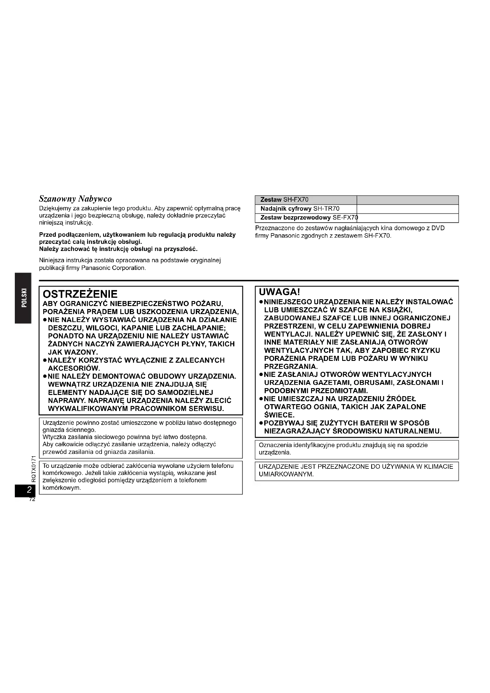 RQTX0171 POLSKI Szanowny Nabywco Dziękujemy za zakupienie tego produktu. Aby zapewnić optymalną pracę urządzenia i jego bezpieczną obsługę, należy dokładnie przeczytać niniejszą instrukcję. Przed podłączeniem, użytkowaniem lub regulacją produktu należy przeczytać całą instrukcję obsługi. Należy zachować tę instrukcję obsługi na przyszłość. Niniejsza instrukcja została opracowana na podstawie oryginalnej publikacji firmy Panasonic Corporation. Przeznaczone do zestawów nagłaśniających kina domowego z DVD firmy Panasonic zgodnych z zestawem SH-FX70.Zestaw SH-FX70Nadajnik cyfrowy SH-TR70Zestaw bezprzewodowy SE-FX70 OSTRZEŻENIE ABY OGRANICZYĆ NIEBEZPIECZEŃSTWO POŻARU, PORAŻENIA PRĄDEM LUB USZKODZENIA URZĄDZENIA, ≥NIE NALEŻY WYSTAWIAĆ URZĄDZENIA NA DZIAŁANIE DESZCZU, WILGOCI, KAPANIE LUB ZACHLAPANIE; PONADTO NA URZĄDZENIU NIE NALEŻY USTAWIAĆ ŻADNYCH NACZYŃ ZAWIERAJĄCYCH PŁYNY, TAKICH JAK WAZONY. ≥NALEŻY KORZYSTAĆ WYŁĄCZNIE Z ZALECANYCH AKCESORIÓW. ≥NIE NALEŻY DEMONTOWAĆ OBUDOWY URZĄDZENIA. WEWNĄTRZ URZĄDZENIA NIE ZNAJDUJĄ SIĘ