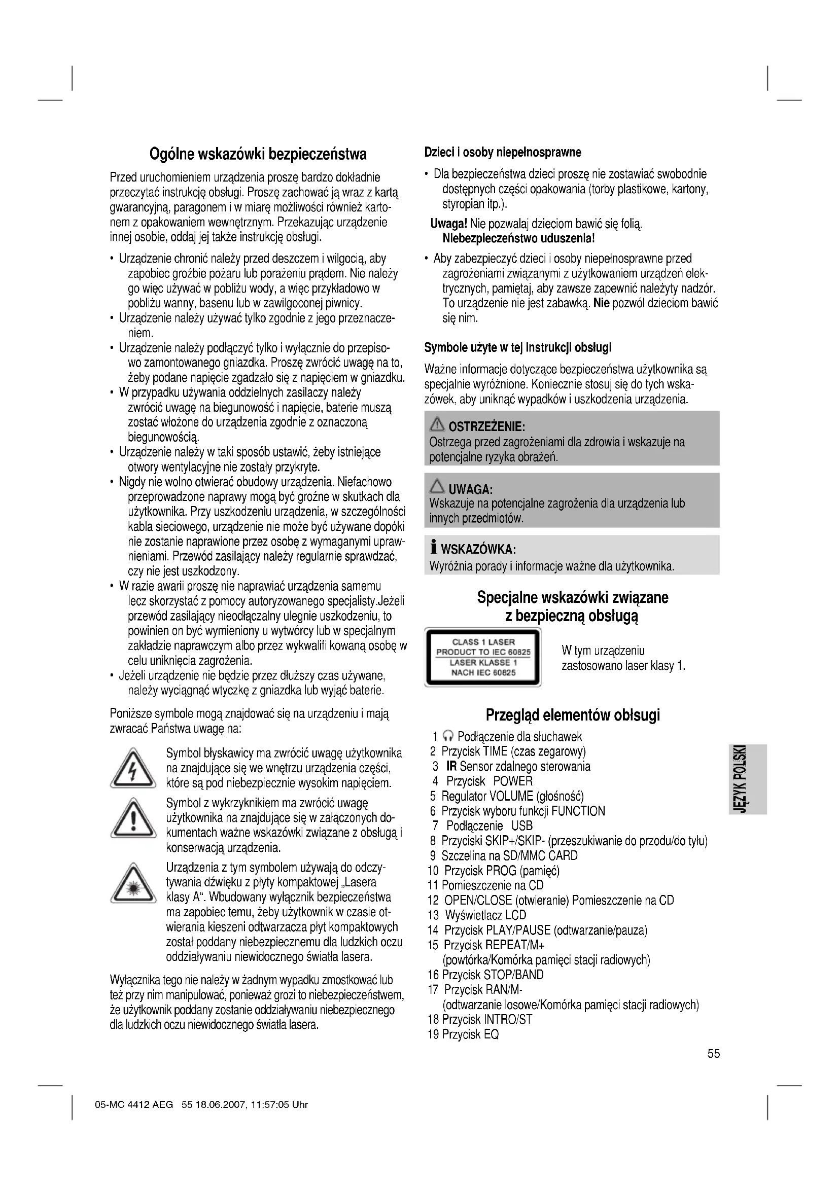 - Aby zabezpieczyć dzieci i osoby niepełnosprawne przed zagrożeniami związanymi z użytkowaniem urządzeń elek- trycznych, pamiętaj, aby zawsze zapewnić należyty nadzór. To urządzenie nie jest zabawką. Nie pozwól dzieciom bawić się nim. Symbole użyte w tej instrukcji obsługi Ważne informacje dotyczące bezpieczeństwa użytkownika są specjalnie wyróżnione. Koniecznie stosuj się do tych wska- zówek, aby uniknąć wypadków i uszkodzenia urządzenia. OSTRZEŻENIE: Ostrzega przed zagrożeniami dla zdrowia i wskazuje na potencjalne ryzyka obrażeń. UWAGA: Wskazuje na potencjalne zagrożenia dla urządzenia lub innych przedmiotów. WSKAZÓWKA: Wyróżnia porady i informacje ważne dla użytkownika. Specjalne wskazówki związane z bezpieczną obsługą W tym urządzeniu zastosowano laser klasy 1. Przegląd elementów obłsugi 1 Podłączenie dla słuchawek 2 Przycisk TIME (czas zegarowy) 3 IR Sensor zdalnego sterowania 4 Przycisk POWER 5 Regulator VOLUME (głośność) 6 Przycisk wyboru funkcji FUNCTION 7 Podłączenie USB 8 Przyciski SKIP+/SKIP- (przeszukiwanie do przodu/do tyłu) 9 Szczelina na SD/MMC CARD 10 Przycisk PROG (pamięć) 11 Pomieszczenie na CD 12 OPEN/CLOSE (otwieranie) Pomieszczenie na CD 13 Wyświetlacz LCD 14 Przycisk PLAY/PAUSE (odtwarzanie/pauza) 15 Przycisk REPEAT/M+ (powtórka/Komórka pamięci stacji radiowych) 16 Przycisk STOP/BAND 17 Przycisk RAN/M- (odtwarzanie losowe/Komórka pamięci stacji radiowych) 18 Przycisk INTRO/ST 19 Przycisk EQ 05-MC 4412 AEG 55 18.06.2007, 11:57:05 Uhr56