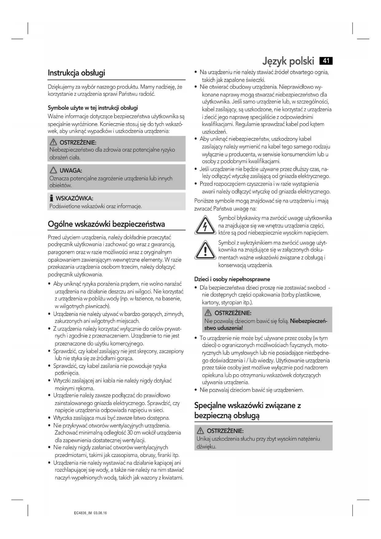 - Nie otwierac odudowy urzadzenia. Nieprawidlowo wykonane naprawy moga stwarzać niebezpieczeanstwo dla uzytkownika. Jesli samo urzadzenia lub, w szcęgólnosci, kabel zasilajacy, są uzzkodzone,Nie korzystac z urzadzenia i zleciść thereof specialzie z odpowiednimi kwalifikacjaami. Regularnie sprawdzać kabel pod kątem uszkodzen.