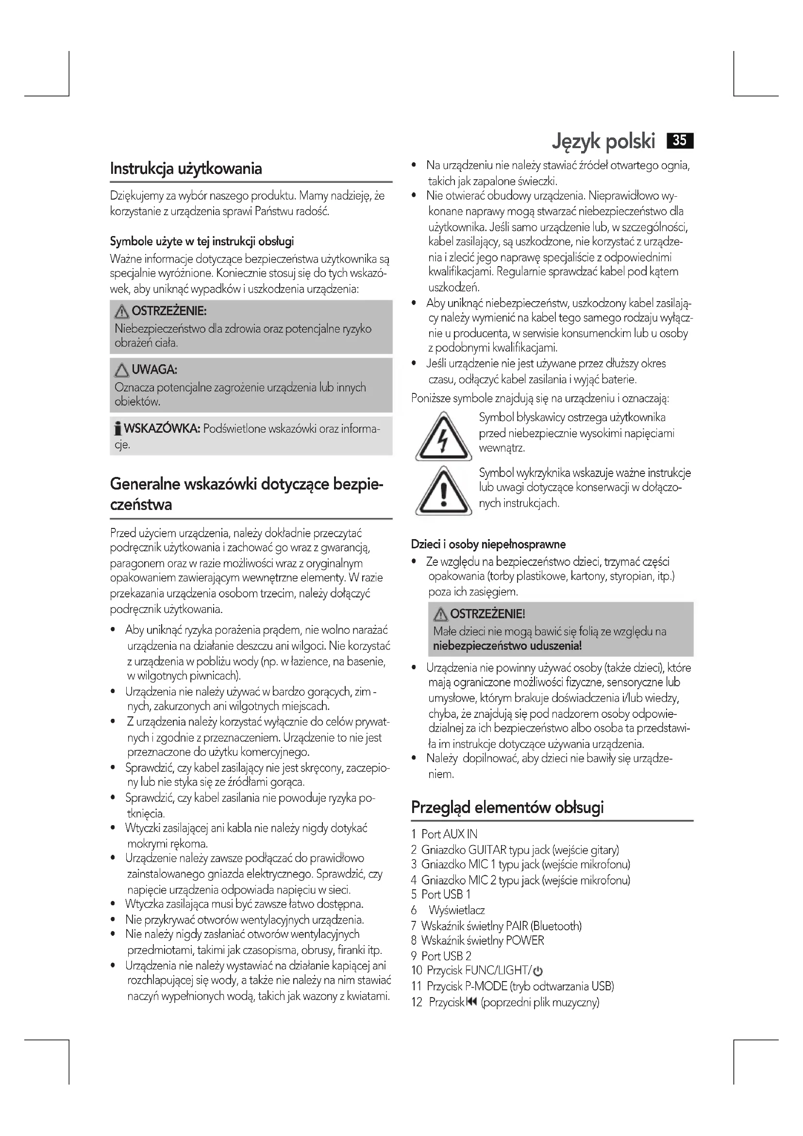 - Urządzenia nie powinny używać osoby (także dzieci), które mają ograniczone możliwości fizyczne, sensoryczne lub umysłowe, którym brakuje doświadczenia i/lub wiedzy, chyba, że znajdują się pod nadzorem osoby odpowiedzialnej za ich bezpieczeństwo albo osoba ta przedstawiła im instrukcje dotyczące używania urządzenia.