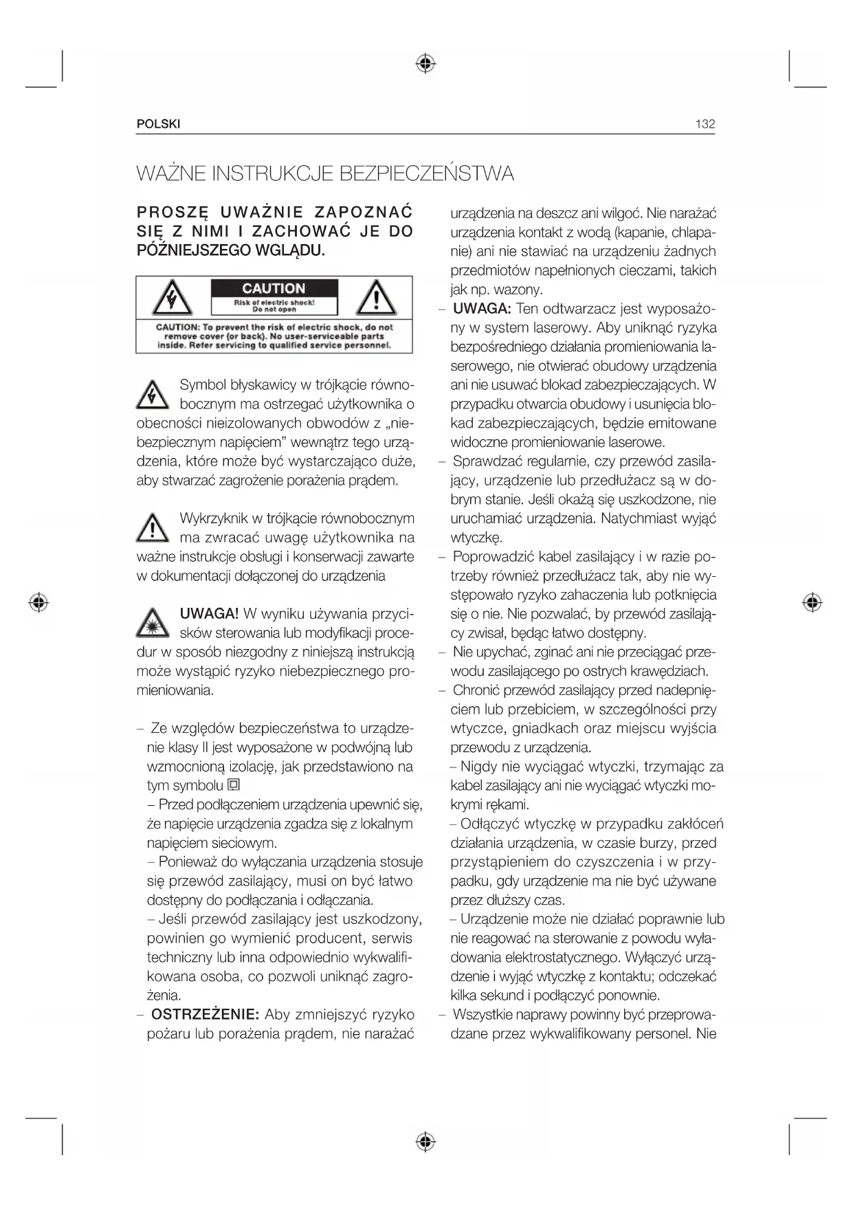 Symbol błyskawicy w trójkącie równo- bocznym ma ostrzegać użytkownika o obecności nieizolowanych obwodów z „nie- bezpiecznym napięciem” wewnątrz tego urzą- dzenia, które może być wystarczająco duże, aby stwarzać zagrożenie porażenia prądem. Wykrzyknik w trójkącie równobocznym ma zwracać uwagę użytkownika na ważne instrukcje obsługi i konserwacji zawarte w dokumentacji dołączonej do urządzenia UWAGA! W wyniku używania przyci- sków sterowania lub modyfikacji proce- dur w sposób niezgodny z niniejszą instrukcją może wystąpić ryzyko niebezpiecznego pro- mieniowania. – Ze względów bezpieczeństwa to urządze- nie klasy II jest wyposażone w podwójną lub wzmocnioną izolację, jak przedstawiono na tym symbolu . – Przed podłączeniem urządzenia upewnić się, że napięcie urządzenia zgadza się z lokalnym napięciem sieciowym. – Ponieważ do wyłączania urządzenia stosuje się przewód zasilający, musi on być łatwo dostępny do podłączania i odłączania. – Jeśli przewód zasilający jest uszkodzony, powinien go wymienić producent, serwis techniczny lub inna odpowiednio wykwalifi- kowana osoba, co pozwoli uniknąć zagro- żenia. – OSTRZEŻENIE: Aby zmniejszyć ryzyko pożaru lub porażenia prądem, nie narażać