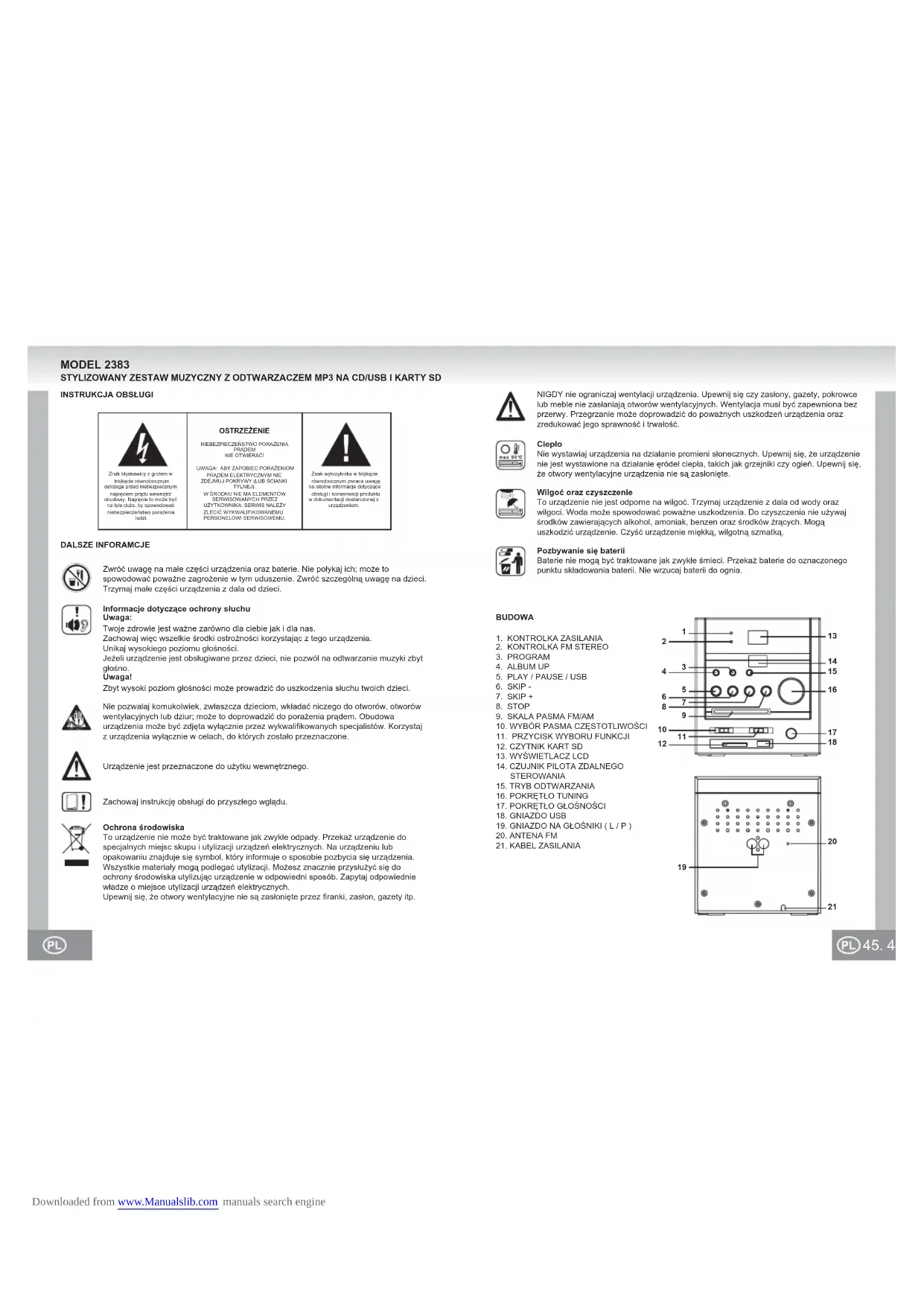 Znak błyskawicy z grotem w trójkącie równobocznym ostrzega przed niebezpiecznym napięciem prądu wewnątrz obudowy. Napięcie to może być na tyle duże, by spowodować niebezpieczeństwo porażenia ludzi.Znak wykrzyknika w trójkącie równobocznym zwraca uwagę na istotne informacje dotyczące obsługi i konserwacji produktu w dokumentacji dostarczonej z urządzeniem.OSTRZEŻENIENIEBEZPIECZEŃSTWO PORAŻENIA PRĄDEMNIE OTWIERAĆ!UWAGA: ABY ZAPOBIEC PORAŻENIOM PRĄDEM ELEKTRYCZNYM NIE ZDEJMUJ POKRYWY (LUB ŚCIANKI TYLNEJ).W ŚRODKU NIE MA ELEMENTÓW SERWISOWANYCH PRZEZ UŻYTKOWNIKA. SERWIS NALEŻY ZLECIĆ WYKWALIFIKOWANEMU PERSONELOWI SERWISOWEMU. MODEL 2383 STYLIZOWANY ZESTAW MUZYCZNY Z ODTWARZACZEM MP3 NA CD/USB I KARTY SDNIGDY nie ograniczaj wentylacji urządzenia. Upewnij się czy zasłony, gazety, pokrowce lub meble nie zasłaniają otworów wentylacyjnych. Wentylacja musi być zapewniona bez przerwy. Przegrzanie może doprowadzić do poważnych uszkodzeń urządzenia oraz zredukować jego sprawność i trwałość. Ochrona środowiskaTo urządzenie nie może być traktowane jak zwykłe odpady. Przekaż urządzenie do specjalnych miejsc skupu i utylizacji urządzeń elektrycznych. Na urządzeniu lub opakowaniu znajduje się symbol, który informuje o sposobie pozbycia się urządzenia. Wszystkie materiały mogą podlegać utylizacji. Możesz znacznie przysłużyć się do ochrony środowiska utylizując urządzenie w odpowiedni sposób. Zapytaj odpowiednie władze o miejsce utylizacji urządzeń elektrycznych.Upewnij się, że otwory wentylacyjne nie są zasłonięte przez firanki, zasłon, gazety itp.Zachowaj instrukcję obsługi do przyszłego wglądu.CiepłoNie wystawiaj urządzenia na działanie promieni słonecznych. Upewnij się, że urządzenie nie jest wystawione na działanie ęródeł ciepła, takich jak grzejniki czy ogień. Upewnij się, że otwory wentylacyjne urządzenia nie są zasłonięte.Wilgoć oraz czyszczenieTo urządzenie nie jest odporne na wilgoć. Trzymaj urządzenie z dala od wody oraz wilgoci. Woda może spowodować poważne uszkodzenia. Do czyszczenia nie używaj środków zawierających alkohol, amoniak, benzen oraz środków żrących. Mogą uszkodzić urządzenie. Czyść urządzenie miękką, wilgotną szmatką.Nie pozwalaj komukolwiek, zwłaszcza dzieciom, wkładać niczego do otworów, otworów wentylacyjnych lub dziur; może to doprowadzić do porażenia prądem. Obudowa urządzenia może być zdjęta wyłącznie przez wykwalifikowanych specjalistów. Korzystaj z urządzenia wyłącznie w celach, do których zostało przeznaczone.Zwróć uwagę na małe części urządzenia oraz baterie. Nie połykaj ich; może to spowodować poważne zagrożenie w tym uduszenie. Zwróć szczególną uwagę na dzieci. Trzymaj małe części urządzenia z dala od dzieci.Urządzenie jest przeznaczone do użytku wewnętrznego.Pozbywanie się bateriiBaterie nie mogą być traktowane jak zwykłe śmieci. Przekaż baterie do oznaczonego punktu składowania baterii. Nie wrzucaj baterii do ognia.INSTRUKCJA OBSŁUGIDALSZE INFORAMCJEInformacje dotyczące ochrony słuchuUwaga:Twoje zdrowie jest ważne zarówno dla ciebie jak i dla nas.Zachowaj więc wszelkie środki ostrożności korzystając z tego urządzenia.Unikaj wysokiego poziomu głośności.Jeżeli urządzenie jest obsługiwane przez dzieci, nie pozwól na odtwarzanie muzyki zbyt głośno.Uwaga!Zbyt wysoki poziom głośności może prowadzić do uszkodzenia słuchu twoich dzieci.BUDOWA1. KONTROLKA ZASILANIA2. KONTROLKA FM STEREO3. PROGRAM4. ALBUM UP5. PLAY / PAUSE / USB6. SKIP -7. SKIP +8. STOP9. SKALA PASMA FM/AM10. WYBÓR PASMA CZĘSTOTLIWOŚCI11. PRZYCISK WYBORU FUNKCJI12. CZYTNIK KART SD13. WYŚWIETLACZ LCD14. CZUJNIK PILOTA ZDALNEGO STEROWANIA15. TRYB ODTWARZANIA16. POKRĘTŁO TUNING17. POKRĘTŁO GŁOŚNOŚCI18. GNIAZDO USB19. GNIAZDO NA GŁOŚNIKI ( L / P )20. ANTENA FM21. KABEL ZASILANIA Downloaded from www.Manualslib.com manuals search engine47. 46.