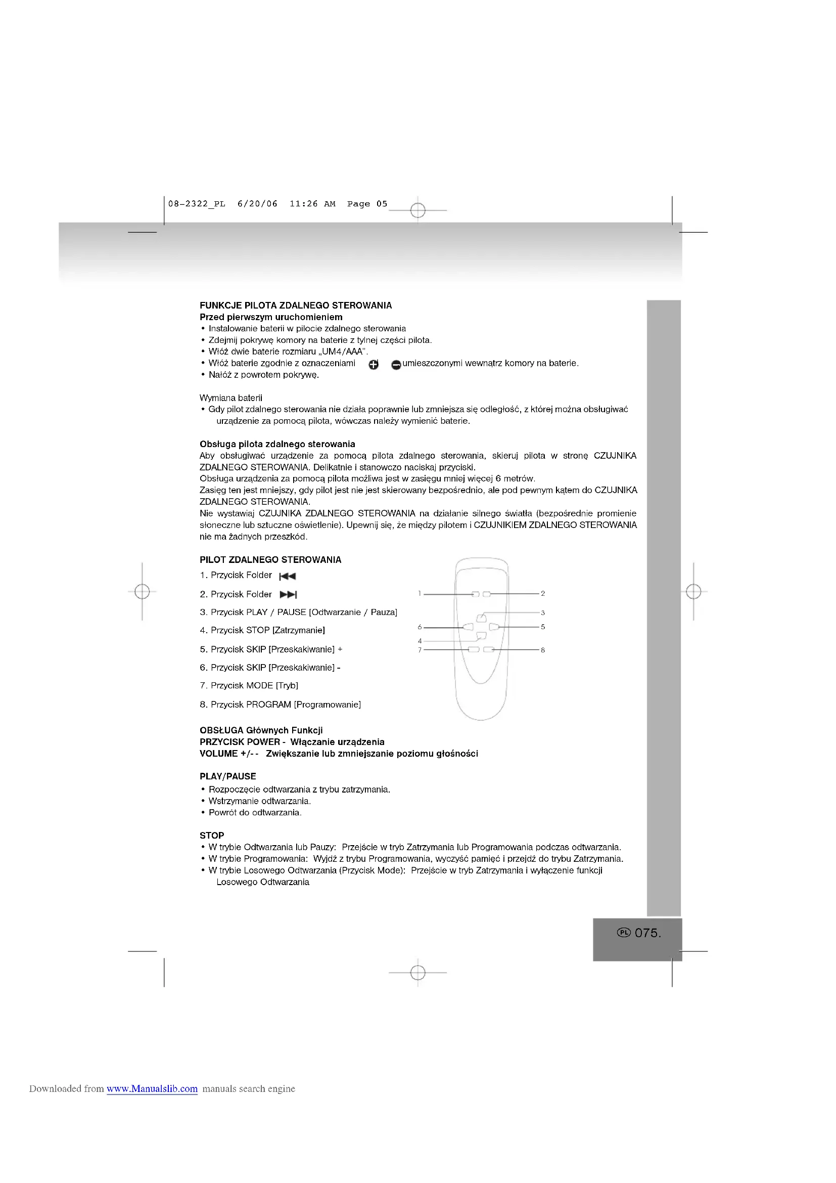 08-2322_PL 6/20/06 11:26 AM Page 04 Downloaded from www.Manualslib.com manuals search engineFUNKCJE PILOTA ZDALNEGO STEROWANIAPrzed pierwszym uruchomieniem• Instalowanie baterii w pilocie zdalnego sterowania• Zdejmij pokrywę komory na baterie z tylnej części pilota.• Włóż dwie baterie rozmiaru „UM4/AAA”.• Włóż baterie zgodnie z oznaczeniami i , umieszczonymi wewnątrz komory na baterie.• Nałóż z powrotem pokrywę.Wymiana baterii• Gdy pilot zdalnego sterowania nie działa poprawnie lub zmniejsza się odległość, z której można obsługiwaćurządzenie za pomocą pilota, wówczas należy wymienić baterie.Obsługa pilota zdalnego sterowaniaAby obsługiwać urządzenie za pomocą pilota zdalnego sterowania, skieruj pilota w stronę CZUJNIKAZDALNEGO STEROWANIA. Delikatnie i stanowczo naciskaj przyciski.Obsługa urządzenia za pomocą pilota możliwa jest w zasięgu mniej więcej 6 metrów.Zasięg ten jest mniejszy, gdy pilot jest nie jest skierowany bezpośrednio, ale pod pewnym kątem do CZUJNIKAZDALNEGO STEROWANIA. Nie wystawiaj CZUJNIKA ZDALNEGO STEROWANIA na działanie silnego światła (bezpośrednie promieniesłoneczne lub sztuczne oświetlenie). Upewnij się, że między pilotem i CZUJNIKIEM ZDALNEGO STEROWANIAnie ma żadnych przeszkód.PILOT ZDALNEGO STEROWANIA1. Przycisk Folder 2. Przycisk Folder 3. Przycisk PLAY / PAUSE [Odtwarzanie / Pauza]4. Przycisk STOP [Zatrzymanie]5. Przycisk SKIP [Przeskakiwanie] +6. Przycisk SKIP [Przeskakiwanie] - 7. Przycisk MODE [Tryb]8. Przycisk PROGRAM [Programowanie]OBSŁUGA Głównych FunkcjiPRZYCISK POWER - Włączanie urządzeniaVOLUME +/- - Zwiększanie lub zmniejszanie poziomu głośnościPLAY/PAUSE• Rozpoczęcie odtwarzania z trybu zatrzymania.• Wstrzymanie odtwarzania.• Powrót do odtwarzania. STOP