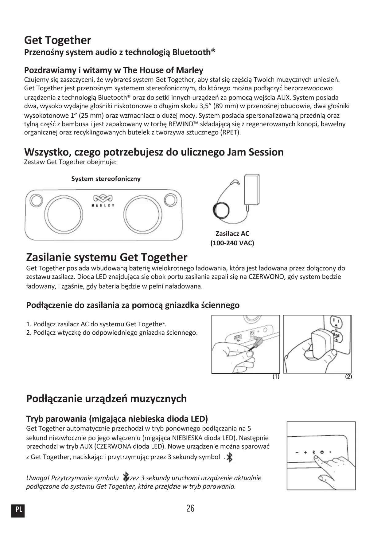 Ez a szimbolum azt jelzi, hogy az elemek nem dobhatok haztartasi hulladek koze, mivel olyan anyagokat tartalmaznak, amelyek karosak lehetnek a kornyezetre es az egeszsegre. Kerjuk, vigye a hasznalt elemeket a kijelolt gyűjtőhelyre. HU26 Get Together Przenośny system audio z technologią Bluetooth® Pozdrawiamy i witamy w The House of Marley Czujemy się zaszczyceni, że wybrałeś system Get Together, aby stał się częścią Twoich muzycznych uniesień. Get Together jest przenośnym systemem stereofonicznym, do którego można podłączyć bezprzewodowo urządzenia z technologią Bluetooth® oraz do setki innych urządzeń za pomocą wejścia AUX. System posiada dwa, wysoko wydajne głośniki niskotonowe o długim skoku 3,5” (89 mm) w przenośnej obudowie, dwa głośniki wysokotonowe 1” (25 mm) oraz wzmacniacz o dużej mocy. System posiada spersonalizowaną przednią oraz tylną część z bambusa i jest zapakowany w torbę REWIND™ składającą się z regenerowanych konopi, bawełny organicznej oraz recyklingowanych butelek z tworzywa sztucznego (RPET). Wszystko, czego potrzebujesz do ulicznego Jam Session Zestaw Get Together obejmuje: System stereofoniczny Zasilacz AC (100-240 VAC) Zasilanie systemu Get Together Get Together posiada wbudowaną baterię wielokrotnego ładowania, która jest ładowana przez dołączony do zestawu zasilacz. Dioda LED znajdująca się obok portu zasilania zapali się na CZERWONO, gdy system będzie ładowany, i zgaśnie, gdy bateria będzie w pełni naładowana. Podłączenie do zasilania za pomocą gniazdka ściennego