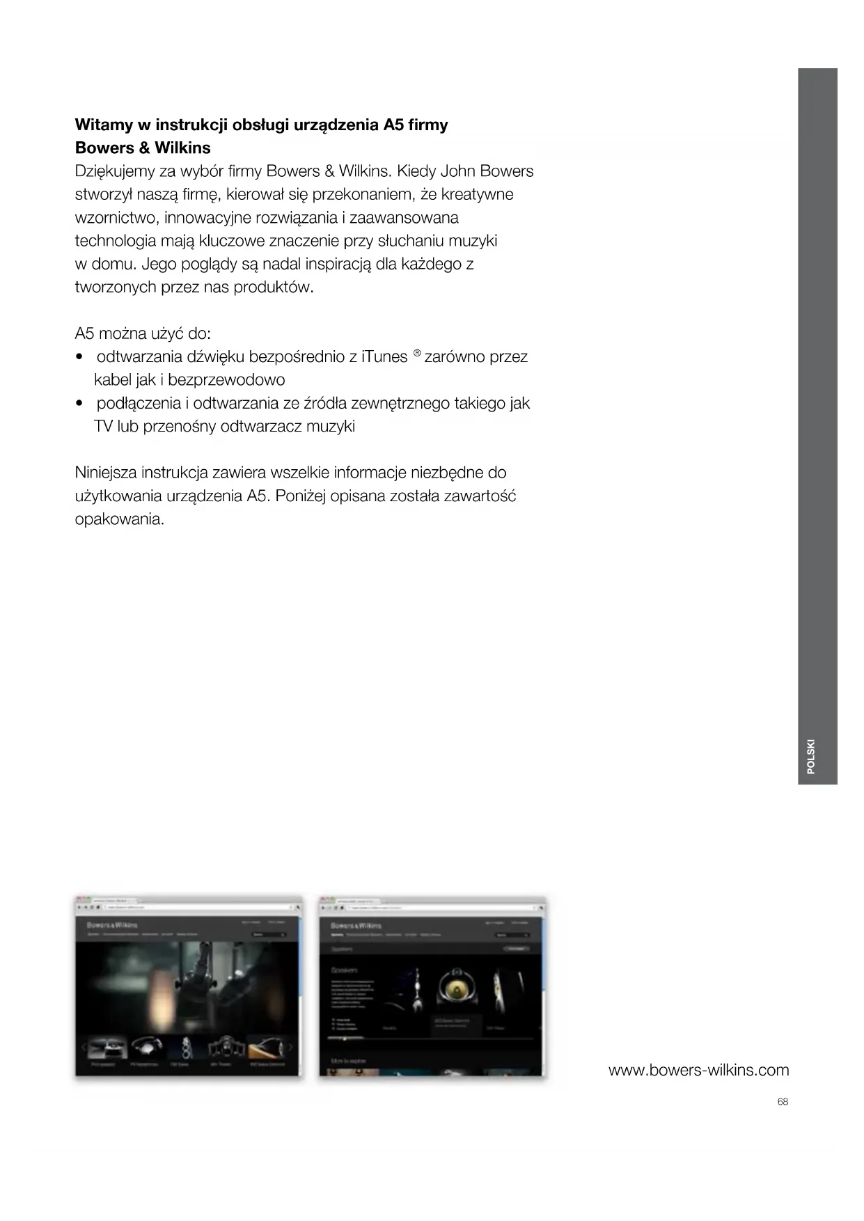 POLSKI www.bowers-wilkins.com Witamy w instrukcji obsługi urządzenia A5 rmy Bowers & Wilkins Dziękujemy za wybór rmy Bowers & Wilkins. Kiedy John Bowers stworzył naszą rmę, kierował się przekonaniem, że kreatywne wzornictwo, innowacyjne rozwiązania i zaawansowana technologia mają kluczowe znaczenie przy słuchaniu muzyki w domu. Jego poglądy są nadal inspiracją dla każdego z tworzonych przez nas produktów. A5 można użyć do: