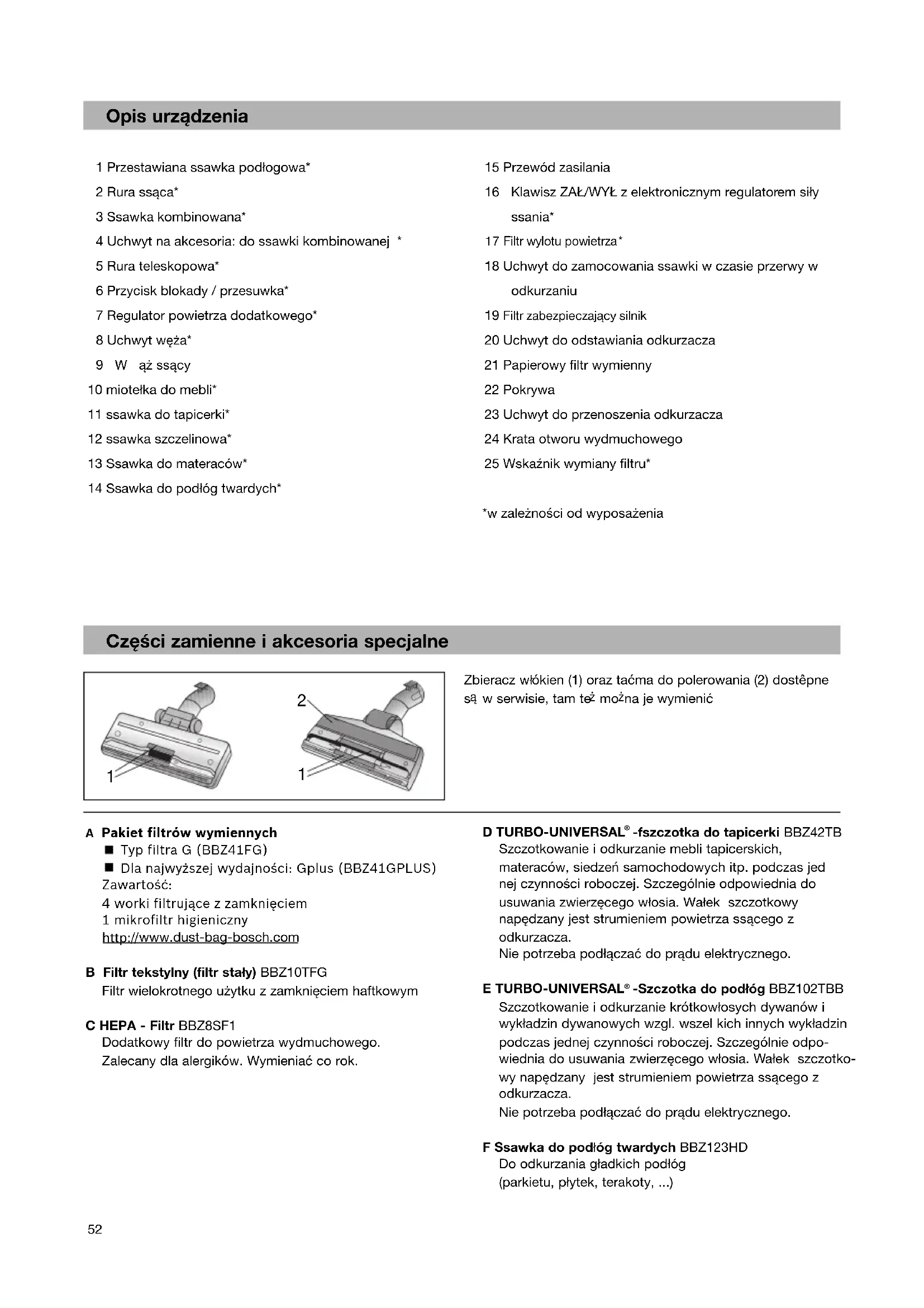 A Pakiet filtrów wymiennych Typ filtra G (BBZ41FG) Dla najwyższej wydajności: Gplus (BBZ41GPLUS) Zawartość: 4 worki filtrujące z zamknięciem 1 mikrofiltr higieniczny http:// www.dust-bag-bosch.com B Filtr tekstylny (filtr stały) BBZ10TFG Filtr wielokrotnego użytku z zamknięciem haftkowym C HEPA - Filtr BBZ8SF1 Dodatkowy filtr do powietrza wydmuchowego. Zalecany dla alergików. Wymieniać co rok. D TURBO-UNIVERSAL