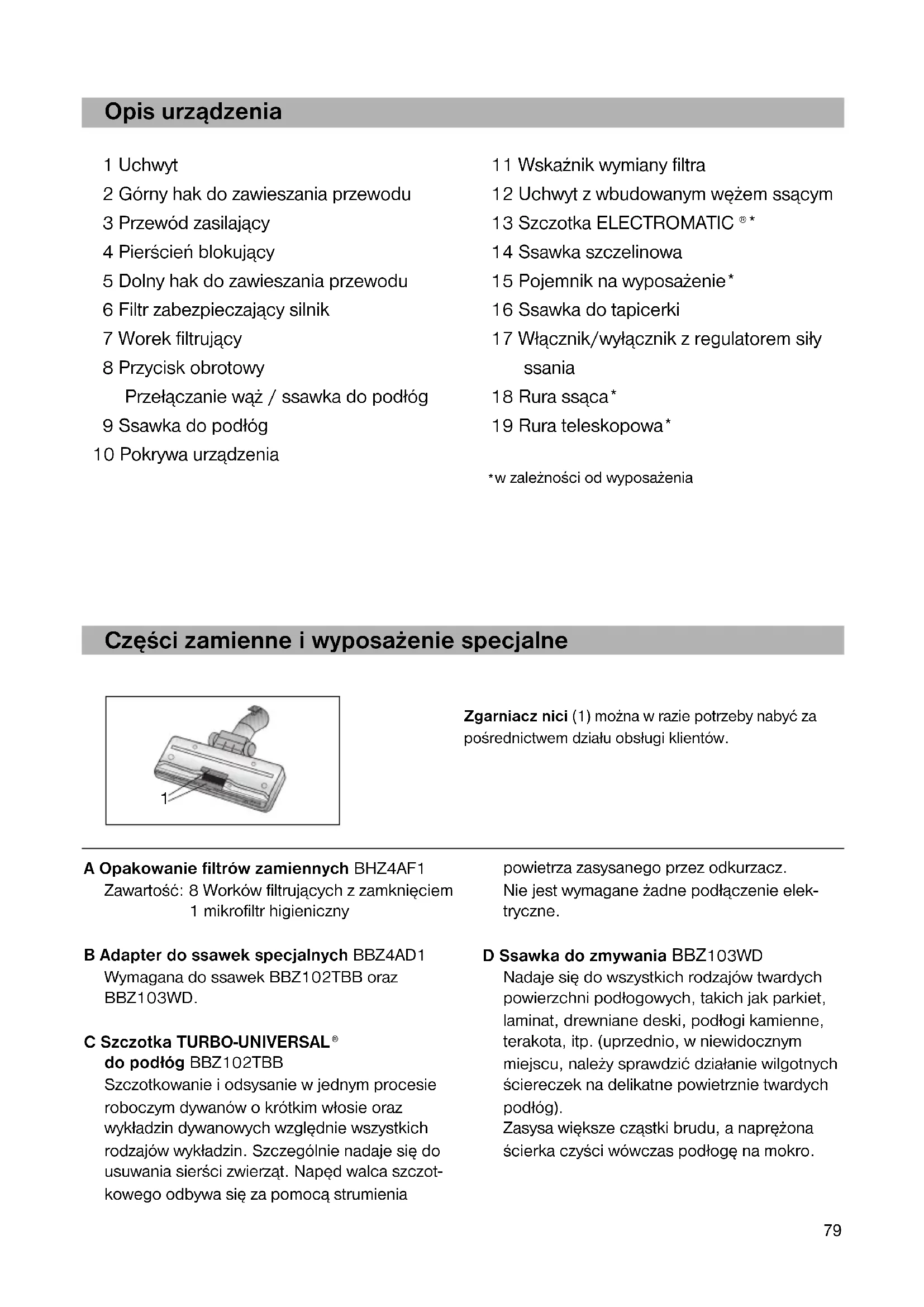 w zależności od wyposażenia A Opakowanie filtrów zamiennych BHZ4AF1 Zawartość: 8 Worków filtrujących z zamknięciem 1 mikrofiltr higieniczny B Adapter do ssawek specjalnych BBZ4AD1 Wymagana do ssawek BBZ102TBB oraz BBZ103WD. C Szczotka TURBO-UNIVERSAL