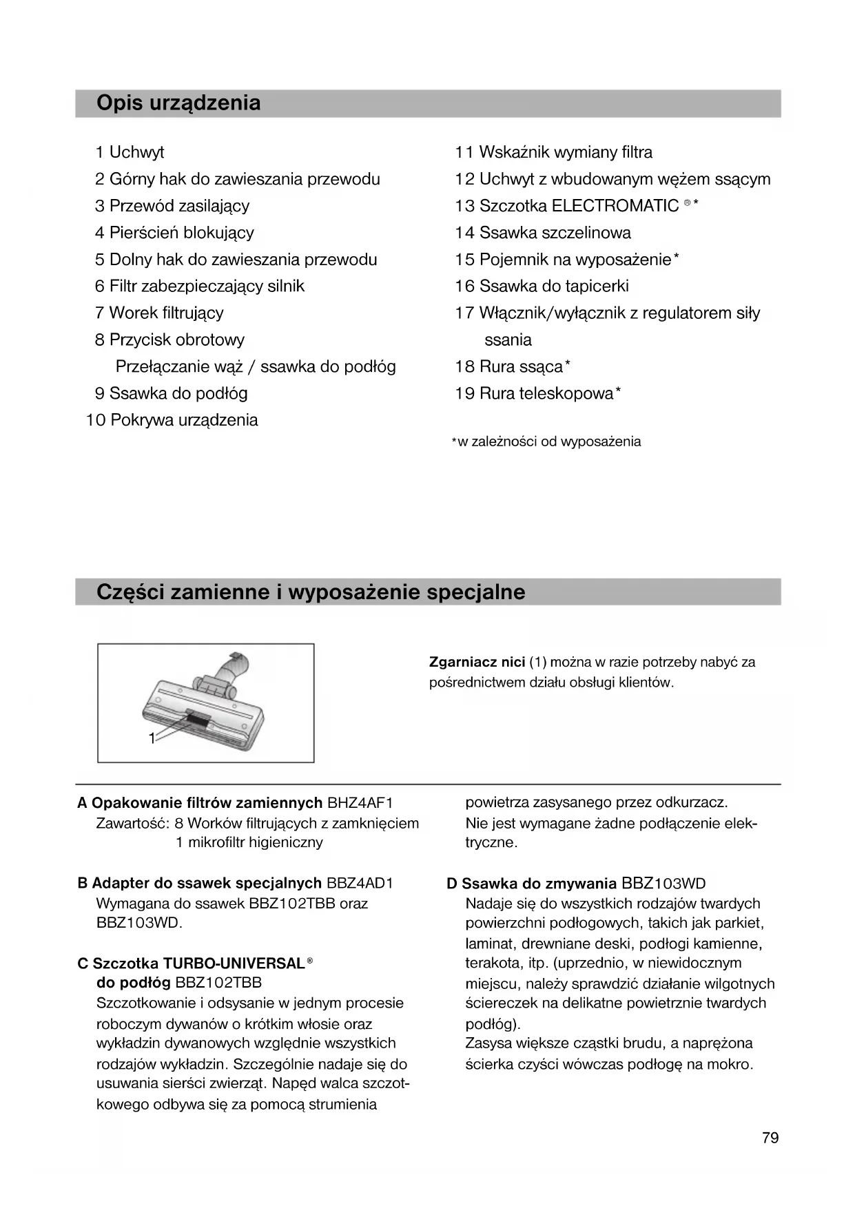 w zależności od wyposażenia A Opakowanie filtrów zamiennych BHZ4AF1 Zawartość: 8 Worków filtrujących z zamknięciem 1 mikrofiltr higieniczny B Adapter do ssawek specjalnych BBZ4AD1 Wymagana do ssawek BBZ102TBB oraz BBZ103WD. C Szczotka TURBO-UNIVERSAL