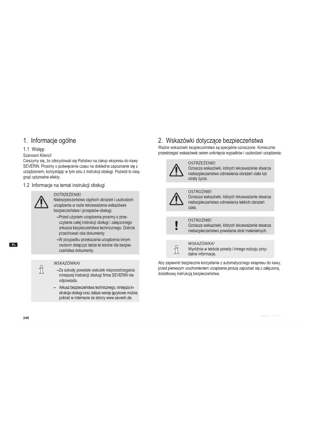 Ważne wskazówki bezpieczeństwa są specjalnie oznaczone. Koniecznie przestrzegać wskazówek celem uniknięcia wypadków i uszkodzeń urządzenia: OSTRZEŻENIE! Oznacza wskazówki, których lekceważenie stwarza niebezpieczeństwo odniesienia obrażeń ciała lub utraty życia. OSTROŻNIE! Oznacza wskazówki, których lekceważenie stwarza niebezpieczeństwo odniesienia lekkich obrażeń ciała. OSTROŻNIE! Oznacza wskazówki, których lekceważenie stwarza niebezpieczeństwo powstania strat materialnych. WSKAZÓWKA! Wyróżnia w tekście porady i innego rodzaju przy- datne informacje. Aby zapewnić bezpieczne korzystanie z automatycznego ekspresu do kawy, przed pierwszym uruchomieniem urządzenia proszę zapoznać się z załączoną, dodatkową instrukcją bezpieczeństwa.249 Wersja 2 2014-11