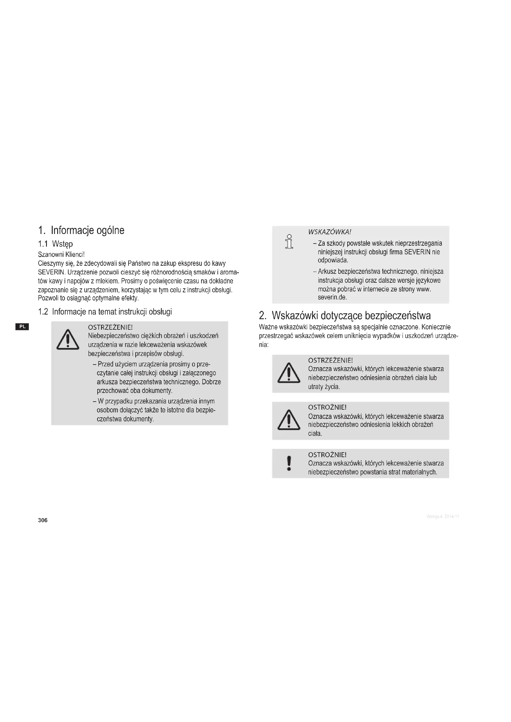 OSTRZEŻENIE! Niebezpieczeństwo ciężkich obrażeń i uszkodzeń urządzenia w razie lekceważenia wskazówek bezpieczeństwa i przepisów obsługi. – Przed użyciem urządzenia prosimy o prze- czytanie całej instrukcji obsługi i załączonego arkusza bezpieczeństwa technicznego. Dobrze przechować oba dokumenty. – W przypadku przekazania urządzenia innym osobom dołączyć także te istotne dla bezpie- czeństwa dokumenty. WSKAZÓWKA! – Za szkody powstałe wskutek nieprzestrzegania niniejszej instrukcji obsługi rma SEVERIN nie odpowiada. – Arkusz bezpieczeństwa technicznego, niniejsza instrukcja obsługi oraz dalsze wersje językowe można pobrać w internecie ze strony www. severin.de.