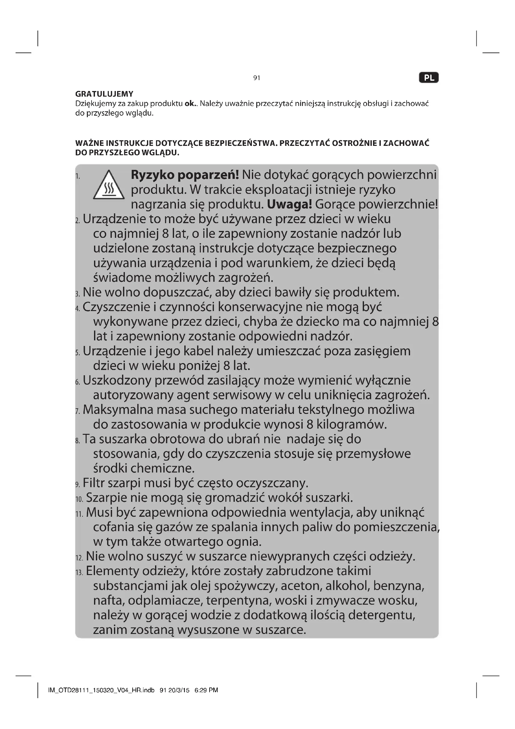 Pobierz instrukcję dla swojego Suszarka do ubrań w formacie PDF za darmo! Znajdź swoją instrukcję OTD 28111 - OK i weź swoje urządzenie elektroniczne z powrotem w ręce. Na tej stronie opublikowane są wszystkie dokumenty niezbędne do korzystania z urządzenia. OTD 28111 marki OK.