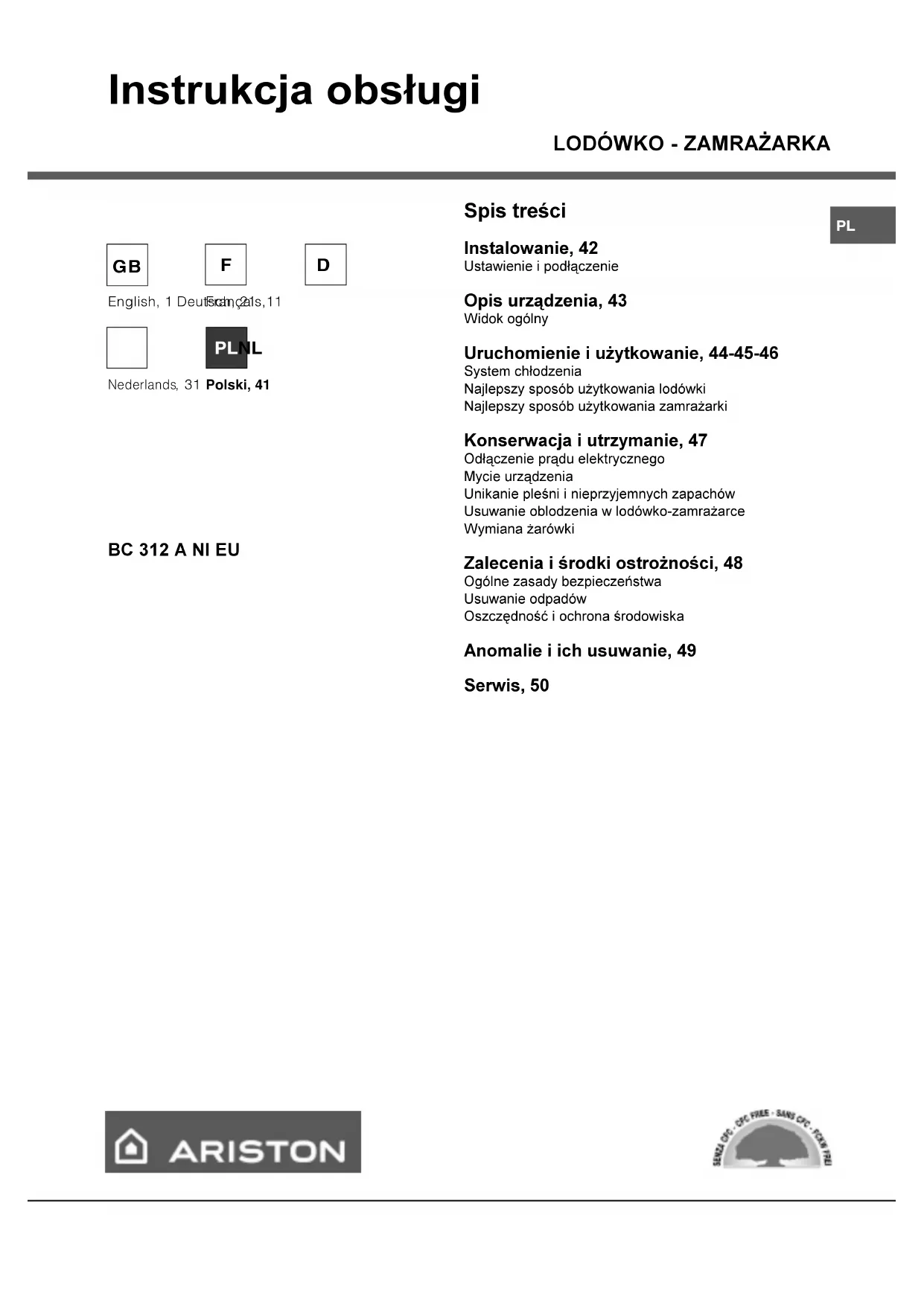 Znajdź bezpłatnie instrukcję urządzenia BC 312 ANI HOTPOINT ARISTON w formacie PDF.
