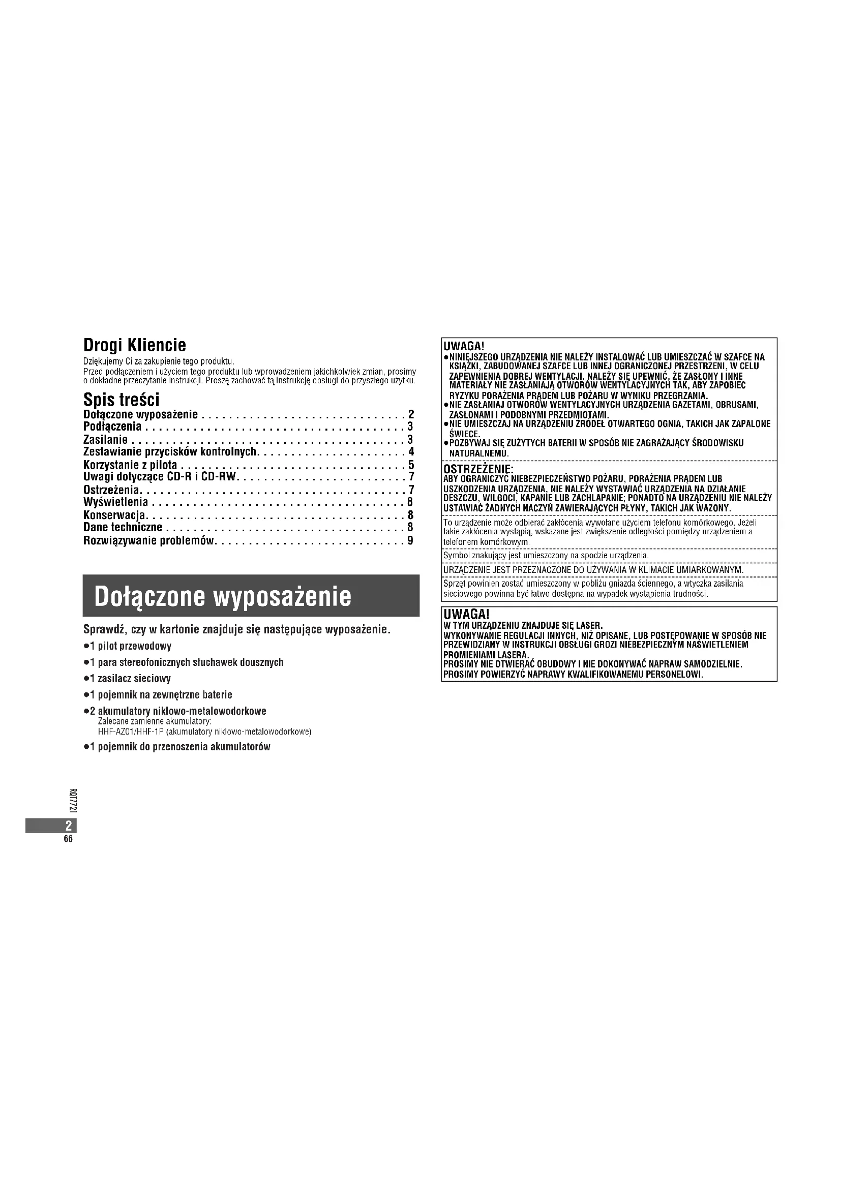 Jeëeli stworzysz taki album, pliki mogà nie byãodtwarzane w kolejnoøci zgodnej z ich numeracjà. Albumy zostanà odtworzone w kolejnoøci 1, 2, 3, 4. (Tylko CD-DA/MP3) Dla formatu CD-DA uëywaj pìyt muzycznych i sfinalizuj je po nagrywaniu. Urzàdzenie moëe niebyã w stanie odtwarzaã niektórych pìyt ze wzglèdu na stan nagrania. Proces wykonywany po nagrywaniu, pozwalajàcy odtwarzaczom pìyt CD-R/CD-RW naodtwarzanie pìyt dœwièkowych CD-R i CD-RW. Do 32 znaków Etykiety ID3 sà ograniczone do 30 znaków Nazwanie øcieëek i albumów Poprzedœ 3-cyfrowymi liczbami odpowiadajàcymi zamierzonej kolejnoøci odtwarzania Rozszerzenie (lub .MP3) Ostrzeëenia ≥Nie wystawiaj urzàdzenia na dziaìanie bezpoøredniego øwiatìa sìonecznego lub ciepìa, np. zurzàdzeæ grzewczych, bo moëe to uszkodziã urzàdzenie.≥Przerwij uëywanie, jeëeli pojawià siè nieprzyjemne odczucia podczas uëywania sìuchawekdousznych lub innych czèøci stykajàcych siè bezpoørednio ze skórà. Dalsze uëywanie moëespowodowaã wysypkè lub inne reakcje alergiczne. ∫Akumulatory ≥Nie zdejmuj z akumulatorów osìonek i nie uëywaj akumulatorów ze zdjètà osìonkà. ≥Ustaw prawidìowo bieguny i i j, kiedy wkìadasz akumulatory. ≥Nie mieszaj akumulatorów róënych typów ani akumulatorów starych i nowych.≥Jeëeli nie zamierzasz uëywaã urzàdzenia przez dìuëszy czas, wyjmij akumulatory.≥Nie wrzucaj do ognia, nie zwieraj, rozbieraj ani nie naraëaj na nadmierne ciepìo.≥Nie próbuj ìadowaã baterii suchych.≥Podczas przenoszenia akumulatorów w kieszeni lub worku zadbaj, aby ëadne metaloweprzedmioty, takie jak naszyjniki, nie byìy wìoëone wraz z nimi. Kontakt z metalem moëespowodowaã zwarcie, które moëe spowodowaã zapalenie. Dla bezpieczeæstwa przenoøakumulatory w pojemniku do przenoszenia akumulatorów. ∫Sìuchanie ≥Nie odtwarzaj dœwièku w sìuchawkach nagìownych lub dousznych zbyt gìoøno. Specjaliøci odsìuchu odradzajà ciàgìego, dìugiego sìuchania.≥Jeëeli doøwiadczysz dzwonienia w uszach, zmniejsz gìoønoøã lub przerwij sìuchanie.≥Nie uëywaj w trakcie prowadzenia pojazdów mechanicznych. Moëe to spowodowaãniebezpieczeæstwo w ruchu drogowym i jest niedozwolone w wielu miejscach.≥W potencjalnie niebezpiecznych sytuacjach powinieneø zachowaã ostroënoøã lub przerwaã nachwilè uëywanie.≥Nawet jeëeli uëywasz sìuchawek nagìownych lub dousznych typu otwartego, pozwalajàcych nasìyszenie dœwièków z otoczenia, nie zwièkszaj gìoønoøci tak bardzo, ëe aë nie bèdziesz sìyszaì,co dzieje siè wokóì Ciebie. ∫Pìyty kompaktowe ≥Nie uëywaj pìyt kompaktowych o nieregularnych ksztaìtach.≥Nie uëywaj pìyt nie wymienionych w danych technicznych.≥Nie uëywaj pìyt kompaktowych zadrukowanych przy uëyciu dostèpnych na rynku drukarek doetykiet.≥Nie uëywaj pìyt kompaktowych z odklejajàcymi siè etykietami i naklejkami lub z klejemwystajàcym spod etykiet i naklejek. Technologia kodowania dœwièku MPEG Layer-3 na licencji Fraunhofer IIS i Thomson multimedia. RQT7721-E5-Cz-Polish05.1.135:08PMページ7172 RQT7721