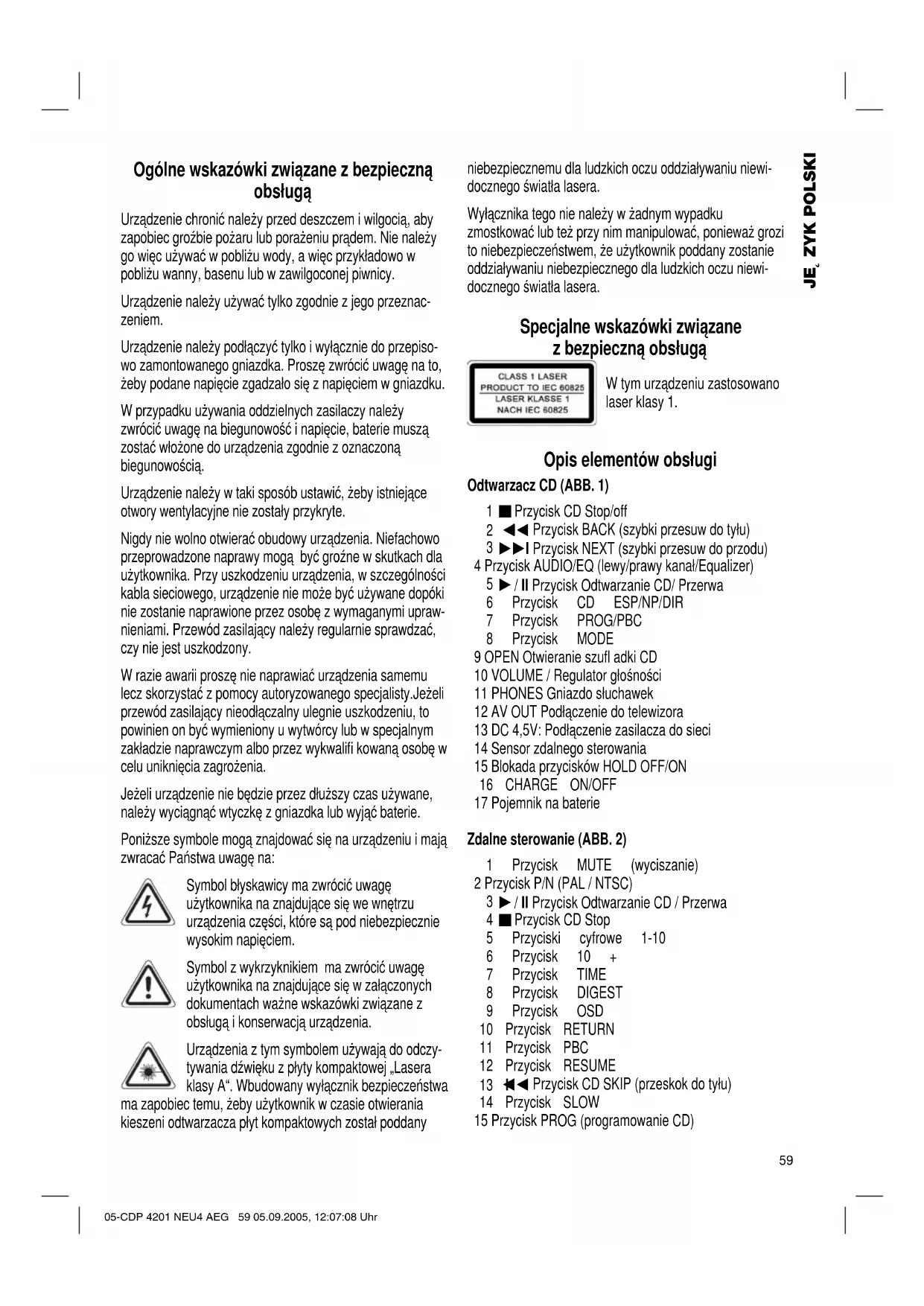 Urządzenia z tym symbolem używają do odczytywania dźwięku z płyty kompaktowej „Lasera klasy A“. Wbudowany wyłącznik bezpieczeństwa