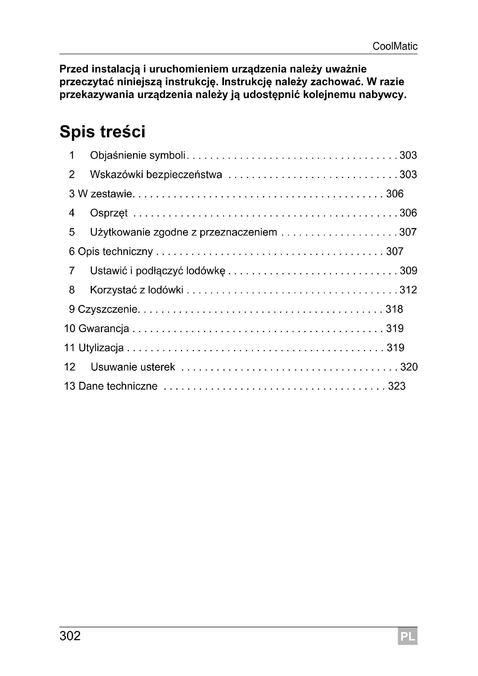 - 13 Dane techniczne PL CoolMatic Objaśnienie symboli p. 323