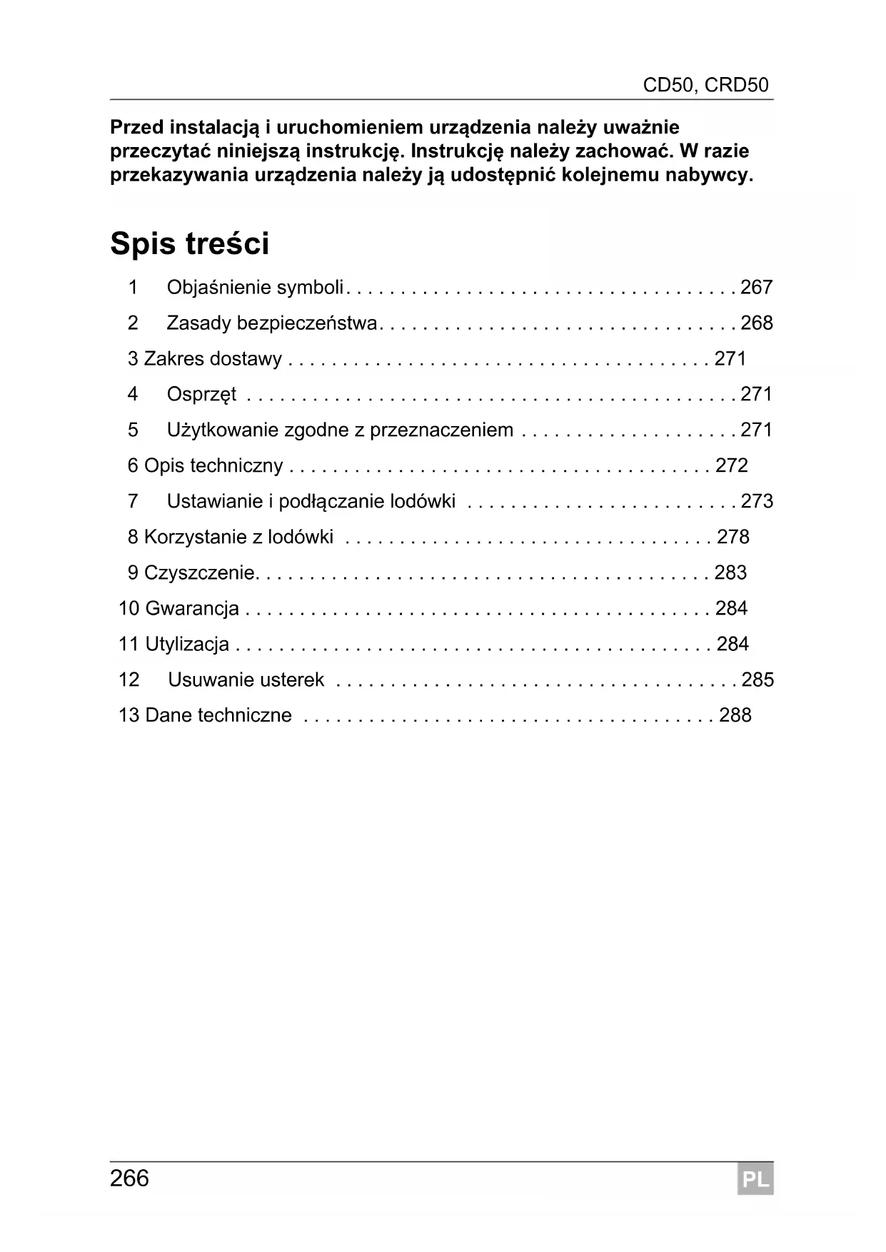 Jeżeli produkt nie będzie dłużej eksploatowany, koniecznie dowiedz się wnajbliższym zakładzie recyklingu lub w specjalistycznym sklepie, jakie są aktualnie obowiązujące przepisy dotyczące utylizacji. OSTRZEŻENIE! Uwaga na dzieci! Przed utylizacją zużytej lodówki: Zdemontować szufladę. Pozostawić półki w lodówce w taki sposób, aby dzieci nie mogły się po nich wspinać.PL CD50, CRD50 Usuwanie usterek