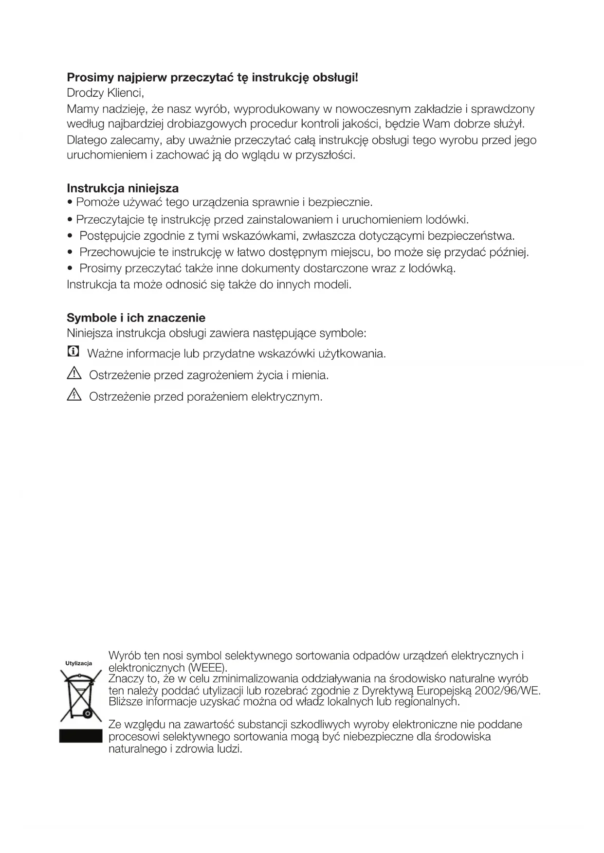 - Prosimy przeczytać także inne dokumenty dostarczone wraz z lodówką. Instrukcja ta może odnosić się także do innych modeli. Symbole i ich znaczenie Niniejsza instrukcja obsługi zawiera następujące symbole: C Ważne informacje lub przydatne wskazówki użytkowania. A Ostrzeżenie przed zagrożeniem życia i mienia. B Ostrzeżenie przed porażeniem elektrycznym. Wyrób ten nosi symbol selektywnego sortowania odpadów urządzeń elektrycznych i elektronicznych (WEEE). Znaczy to, że w celu zminimalizowania oddziaływania na środowisko naturalne wyrób ten należy poddać utylizacji lub rozebrać zgodnie z Dyrektywą Europejską 2002/96/WE. Bliższe informacje uzyskać można od władz lokalnych lub regionalnych. Ze względu na zawartość substancji szkodliwych wyroby elektroniczne nie poddane procesowi selektywnego sortowania mogą być niebezpieczne dla środowiska naturalnego i zdrowia ludzi. UtylizacjaPL