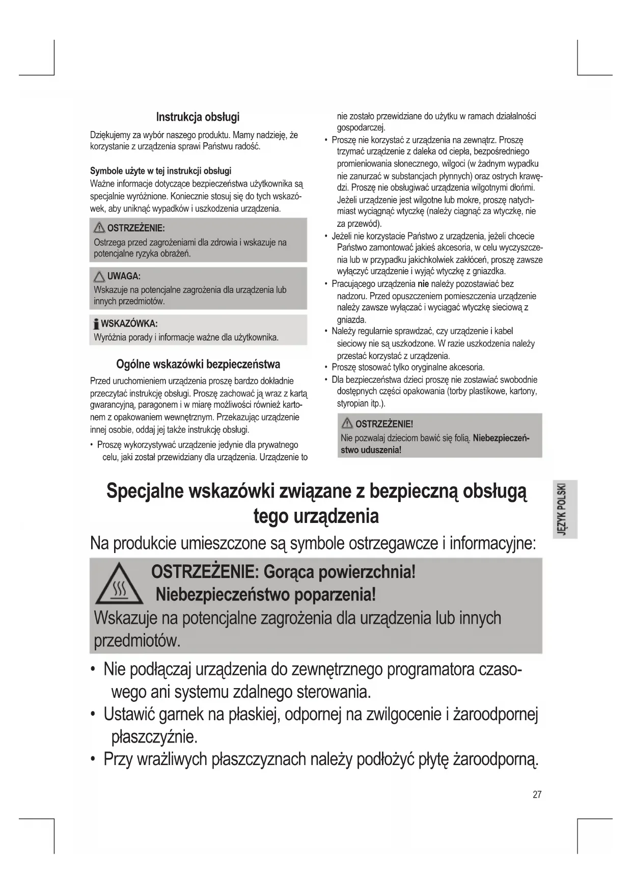 - Dla bezpieczeństwa dzieci proszę nie zostawiać swobodnie dostępnych części opakowania (torby plastikowe, kartony, styropian itp.). OSTRZEŻENIE! Nie pozwalaj dzieciom bawić się folią. Niebezpieczeń- stwo uduszenia! Specjalne wskazówki związane z bezpieczną obsługą tego urządzenia Na produkcie umieszczone są symbole ostrzegawcze i informacyjne: OSTRZEŻENIE: Gorąca powierzchnia! Niebezpieczeństwo poparzenia! Wskazuje na potencjalne zagrożenia dla urządzenia lub innych przedmiotów.