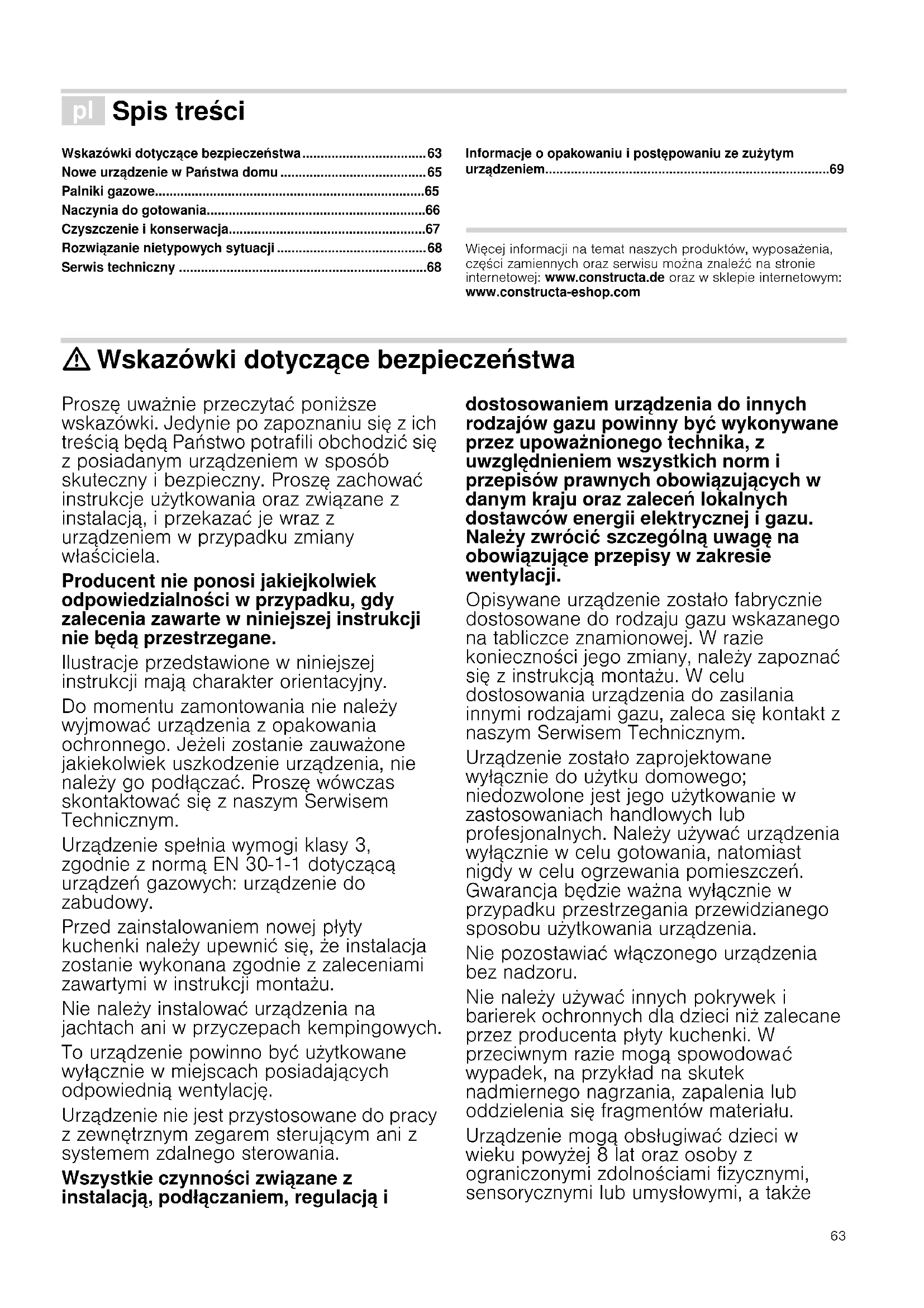 - Embalagem e aparelhos utilizados Produktinfo Obtenha mais informações relativas a produtos, acessórios, peças sobresselentes e Assistência Técnica na Internet: www.constructa.de e na loja Online: www.constructa-eshop.com : Indicações de segurança Leia atentamente estas instruções. Só assim poderá manusear o aparelho de forma eficaz e segura. Conserve as instruções de uso e de instalação e entregue-as juntamente com o aparelho se este mudar de dono. O fabricante fica isento de qualquer tipo de responsabilidade caso não se cumpram as disposições deste manual. As imagens apresentadas ao longo das instruções servem apenas para orientação. Não retire o aparelho da embalagem de protecção até ao momento de ser encastrado. Se observar algum dano no aparelho, não o ligue. Entre em contacto com o nosso Serviço de Assistência Técnica. Este aparelho corresponde à classe 3, segundo a norma EN 30-1-1 para aparelhos a gás: aparelho encastrado num móvel. Antes de instalar a sua nova placa de cozedura, certifique-se de que segue todas as instruções de montagem durante a instalação. Este aparelho não pode ser instalado em iates ou caravanas. Este aparelho deve ser apenas utilizado em locais com uma ventilação adequada. Este aparelho não foi previsto para ser utilizado com um temporizador externo ou um telecomando externo. Todos os trabalhos de instalação, ligação, regulação e adaptação a outros tipos de gás devem ser efectuados por um técnico autorizado, respeitando todas as regulamentações e legislação aplicáveis, bem como o estipulado pelas empresas locais fornecedoras de gás e electricidade. Deve prestar particular atenção às disposições aplicáveis relativamente à ventilação. Este aparelho vem adaptado da fábrica para o tipo de gás indicado na placa de características. Caso seja necessário alterar o tipo de gás, consulte as instruções de montagem. Recomenda-se chamar o nosso Serviço de Assistência Técnica para a adaptação a outros tipos de gás. Este aparelho foi unicamente concebido para utilização doméstica, não podendo, por isso, ser utilizado para fins comerciais ou profissionais. Utilize o aparelho unicamente para cozinhar, nunca como aparelho de aquecimento. A garantia apenas será válida caso o aparelho seja utilizado correctamente e para os fins a que se destina. Não deixe o aparelho a funcionar sem vigilância. Não utilize tampas ou barreiras de protecção, para crianças, que não sejam recomendadas pelo fabricante da placa de cozedura. Podem provocar acidentes, por ex. devido ao sobreaquecimento, ignição ou libertação de fragmentos de materiais. Este aparelho não pode ser utilizado por crianças com mais de 8 anos e pessoas com capacidades físicas, sensoriais ou mentais reduzidas ou que não disponham de experiência suficiente, excepto sob vigilância ou sob instruções específicas de utilização segura do aparelho, e desde que entendam os perigos resultantes da mesma. Não deixe que as crianças brinquem com o aparelho. Não permita a limpeza e manutenção do aparelho pelo utilizador a crianças sem vigilância.71 Perigo de deflagração! A acumulação do gás que não é queimado, num espaço fechado, pode causar deflagração. Não submeta o aparelho a correntes de ar. Os queimadores poderiam apagar-se. Leia atentamente as instruções e advertências relativas ao funcionamento dos queimadores a gás. Perigo de intoxicação! A utilização de um aparelho de cozedura a gás produz calor, humidade e produtos de combustão no local onde está instalado. Garanta uma boa ventilação na cozinha, especialmente enquanto a placa de cozedura estiver em funcionamento: mantenha as aberturas de ventilação natural abertas ou instale um dispositivo de ventilação mecânica (campânula com exaustor). A utilização intensa e prolongada do aparelho pode requerer uma ventilação complementar ou mais eficaz: abra uma janela ou aumente a potência da ventilação mecânica. Perigo de queimaduras! As zonas de cozedura e zonas adjacentes aquecem muito. Nunca toque nas superfícies quentes. Mantenha as crianças com menos de 8 anos afastadas do aparelho. Perigo de incêndio! p. 75