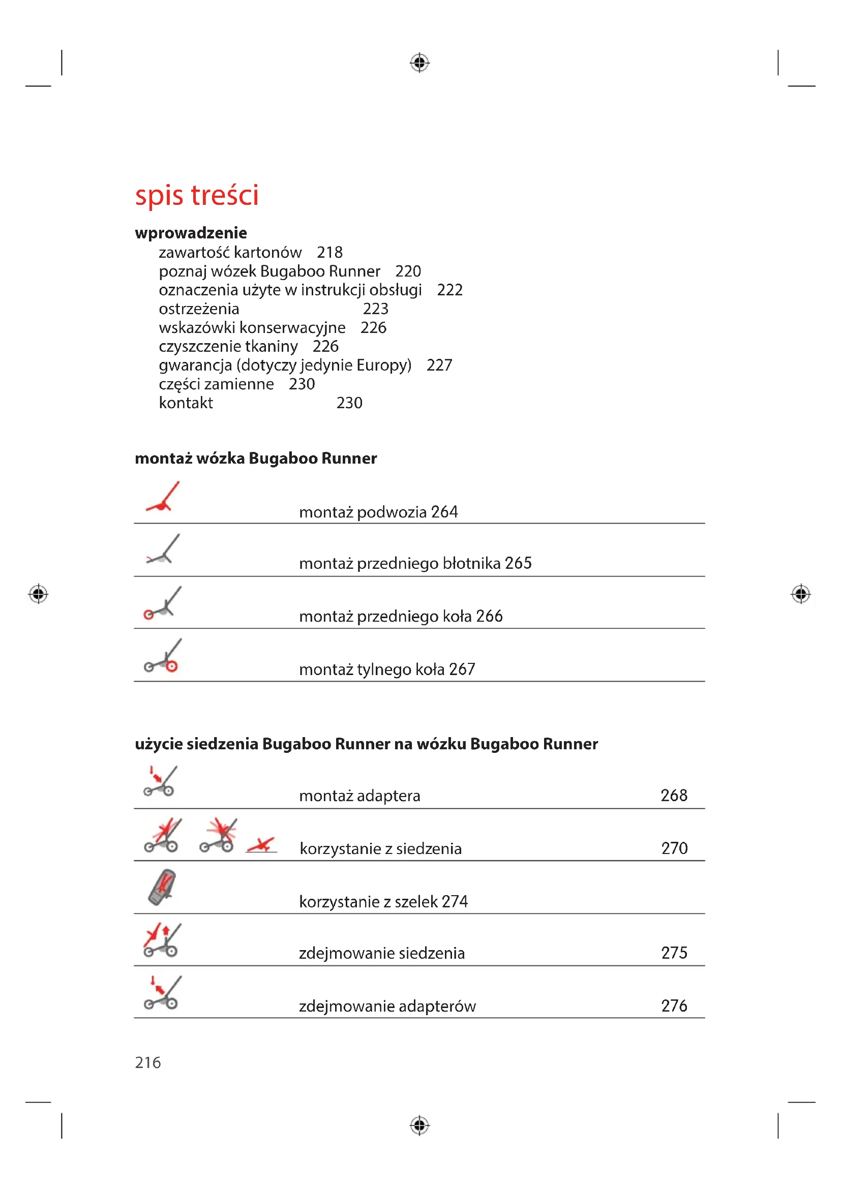 TRspis treści wprowadzenie zawartość kartonów 218 poznaj wózek Bugaboo Runner 220 oznaczenia użyte w instrukcji obsługi 222 ostrzeżenia 223 wskazówki konserwacyjne 226 czyszczenie tkaniny 226 gwarancja (dotyczy jedynie Europy) 227 części zamienne 230 kontakt 230 montaż wózka Bugaboo Runner montaż podwozia 264 montaż przedniego błotnika 265 montaż przedniego koła 266 montaż tylnego koła 267 użycie siedzenia Bugaboo Runner na wózku Bugaboo Runner montaż adaptera 268 korzystanie z siedzenia 270 korzystanie z szelek 274 zdejmowanie siedzenia 275 zdejmowanie adapterów 276 216korzystanie z wózka Bugaboo Runner użycie hamulca postojowego 277 użycie hamulca kontroli prędkości 278 regulacja rączki 279 regulacja ustawienia kół 280 składanie podwozia 281 rozkładanie podwozia 283 zdejmowanie kół tylnych 284 zdejmowanie koła przedniego 285 zdejmowanie koszyka pod siedzenie 286 montaż koszyka pod siedzenie 288 korzystanie z paska na nadgarstek 290 pompowanie kół 291