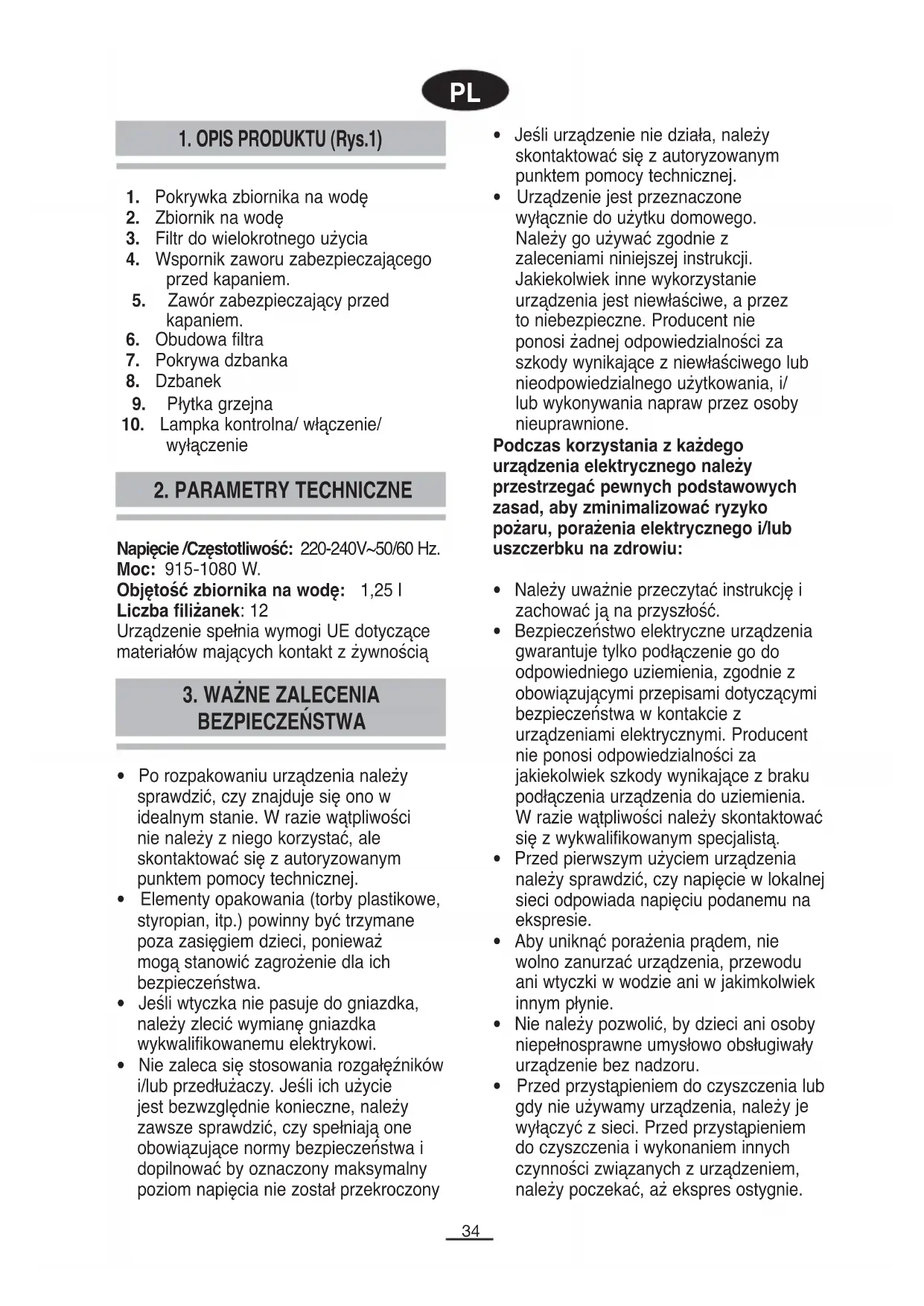 Napięcie /Częstotliwość: 220-240V~50/60 Hz. Moc: 915-1080 W. Objętość zbiornika na wodę: 1,25 l Liczba filiżanek: 12 Urządzenie spełnia wymogi UE dotyczące materiałów mających kontakt z żywnością35