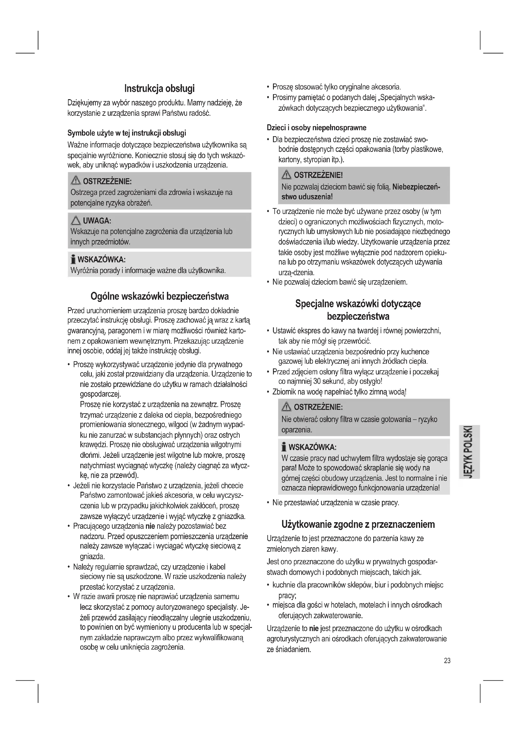 - Nie przestawiać urządzenia w czasie pracy. Użytkowanie zgodne z przeznaczeniem Urządzenie to jest przeznaczone do parzenia kawy ze zmielonych ziaren kawy. Jest ono przeznaczone do użytku w prywatnych gospodar- stwach domowych i podobnych miejscach, takich jak.