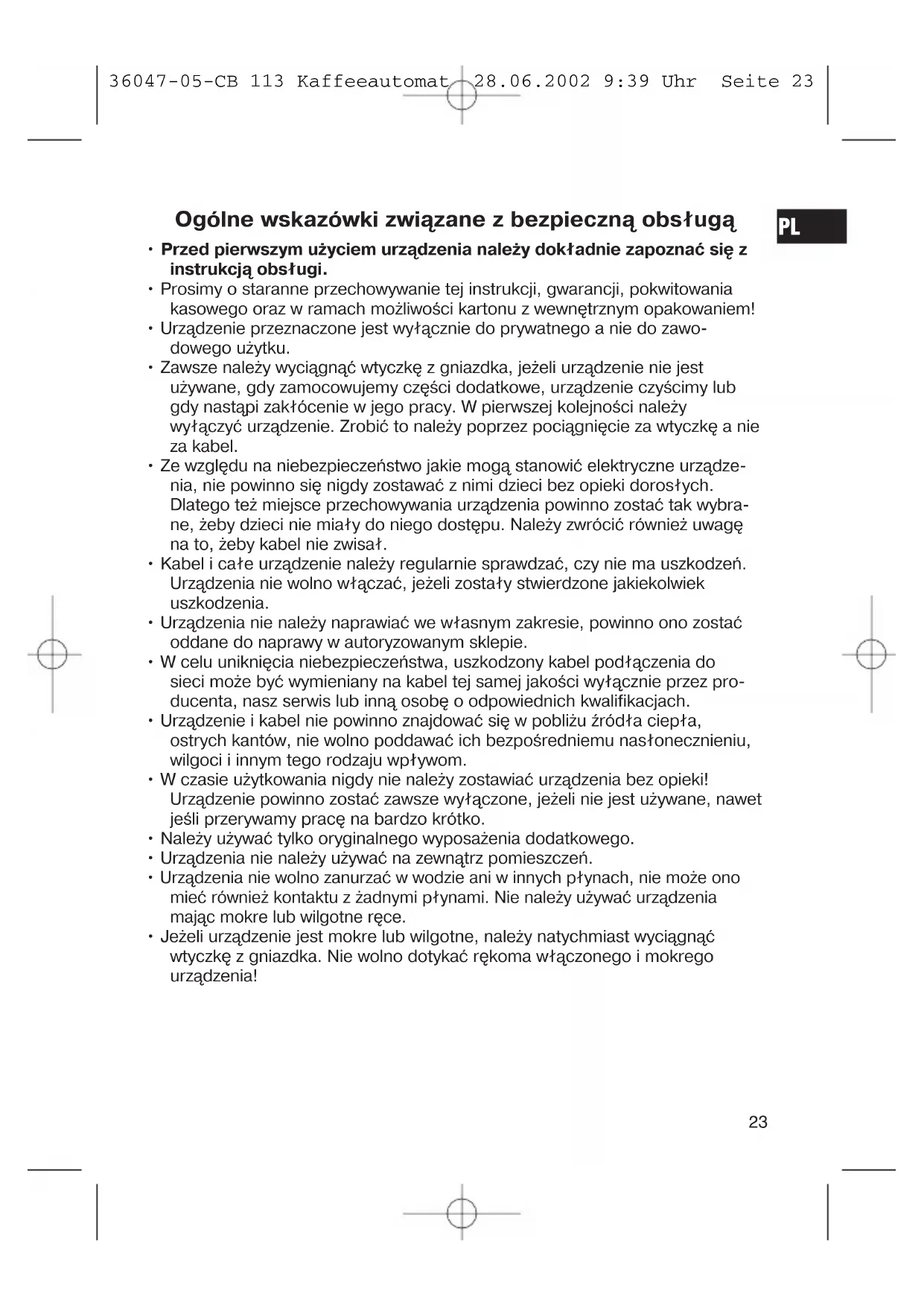 36047-05-CB 113 Kaffeeautomat 28.06.2002 9:39 Uhr Seite 23Specjalne wskazówki związane z bezpieczną obsługą tego urządzenia