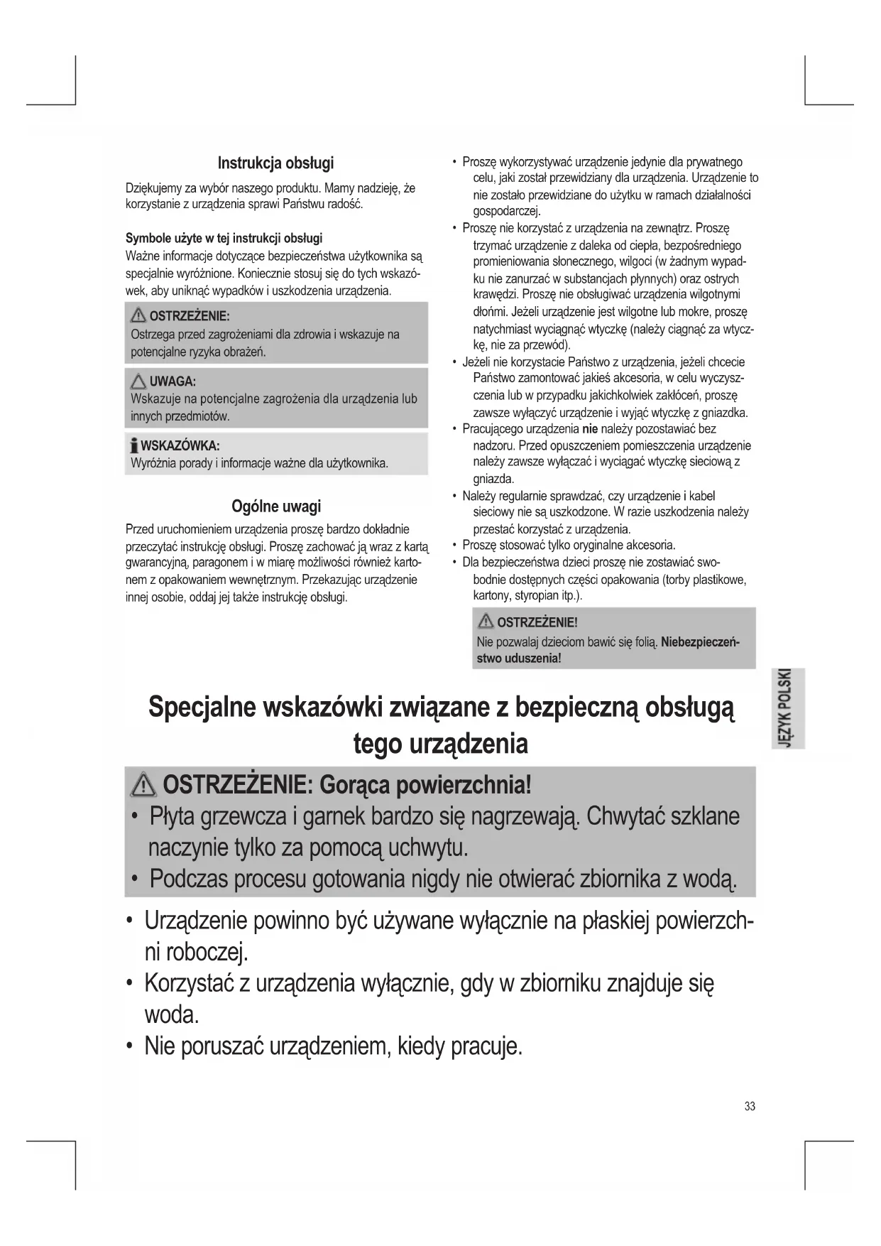 - Dla bezpieczeństwa dzieci proszę nie zostawiać swo- bodnie dostępnych części opakowania (torby plastikowe, kartony, styropian itp.). OSTRZEŻENIE! Nie pozwalaj dzieciom bawić się folią. Niebezpieczeń- stwo uduszenia! Instrukcja obsługi Dziękujemy za wybór naszego produktu. Mamy nadzieję, że korzystanie z urządzenia sprawi Państwu radość. Symbole użyte w tej instrukcji obsługi Ważne informacje dotyczące bezpieczeństwa użytkownika są specjalnie wyróżnione. Koniecznie stosuj się do tych wskazó- wek, aby uniknąć wypadków i uszkodzenia urządzenia. OSTRZEŻENIE: Ostrzega przed zagrożeniami dla zdrowia i wskazuje na potencjalne ryzyka obrażeń. UWAGA: Wskazuje na potencjalne zagrożenia dla urządzenia lub innych przedmiotów. WSKAZÓWKA: Wyróżnia porady i informacje ważne dla użytkownika. Ogólne uwagi Przed uruchomieniem urządzenia proszę bardzo dokładnie przeczytać instrukcję obsługi. Proszę zachować ją wraz z kartą gwarancyjną, paragonem i w miarę możliwości również karto- nem z opakowaniem wewnętrznym. Przekazując urządzenie innej osobie, oddaj jej także instrukcję obsługi. Specjalne wskazówki związane z bezpieczną obsługą tego urządzenia OSTRZEŻENIE: Gorąca powierzchnia!