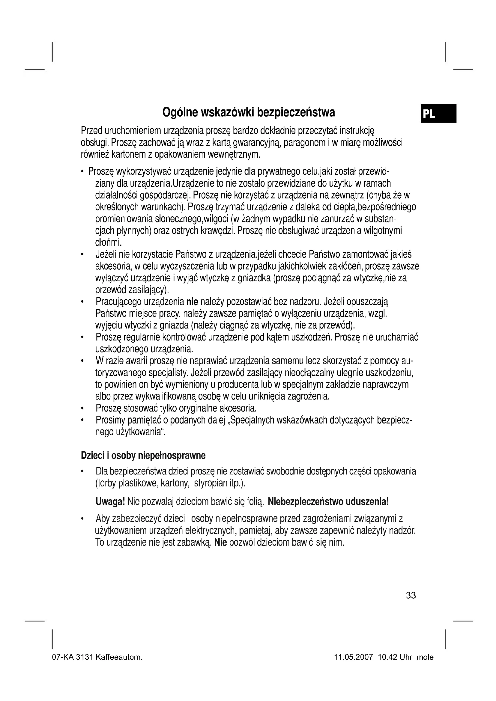 - Aby zabezpieczyć dzieci i osoby niepełnosprawne przed zagrożeniami związanymi z użytkowaniem urządzeń elektrycznych, pamiętaj, aby zawsze zapewnić należyty nadzór. To urządzenie nie jest zabawką. Nie pozwól dzieciom bawić się nim. 07-KA 3131 Kaffeeautom. 11.05.2007 10:42 Uhr moleSpecjalne wskazówki związane z bezpieczną obsługą tego urządzenia