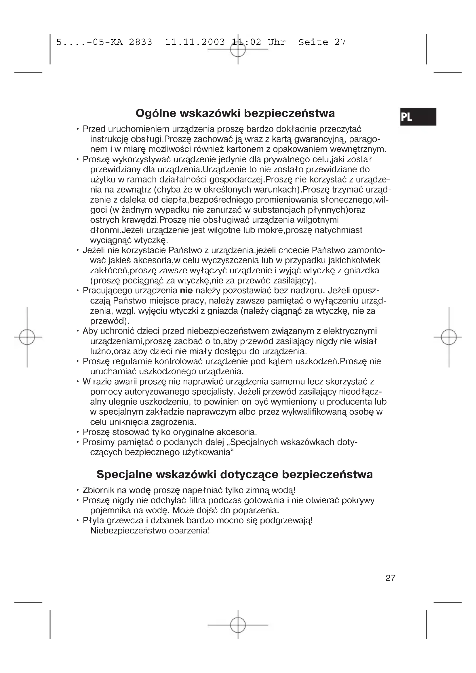 5....-05-KA 2833 11.11.2003 11:02 Uhr Seite 28Odkamienianie Gdy czas przygotowywania kawy ulega znacznemu wydłużeniu niezbędne jest odkamienianie urządzenia. Do usuwania kamienia proszę używać preparatów dostępnych w handlu na bazie kwasku cytrynowego. Proszę dozować środek tak, jak podane zostało na ulotce. Czyszczenie