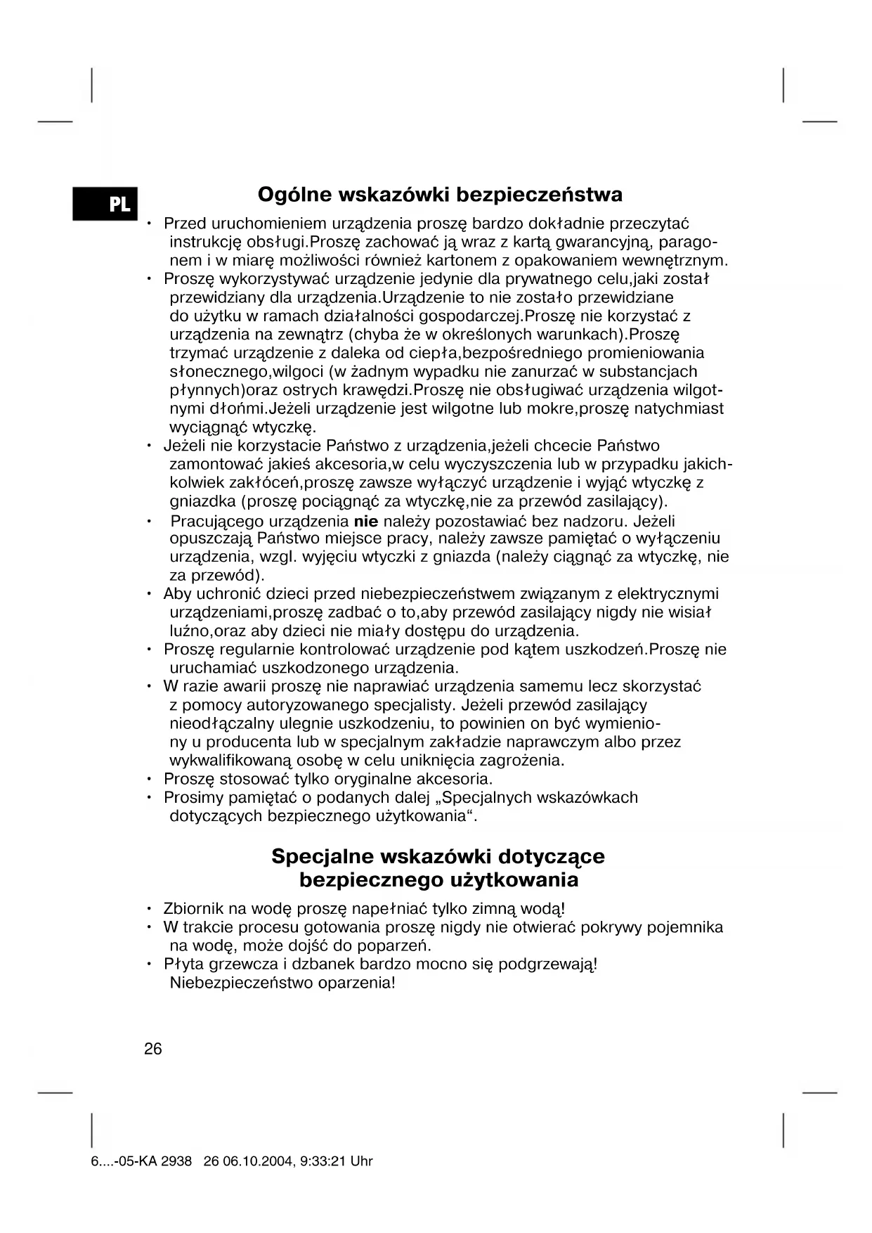 - Płyta grzewcza i dzbanek bardzo mocno się podgrzewają! Niebezpieczeństwo oparzenia! 6....-05-KA 2938 26 06.10.2004, 9:33:21 UhrPL