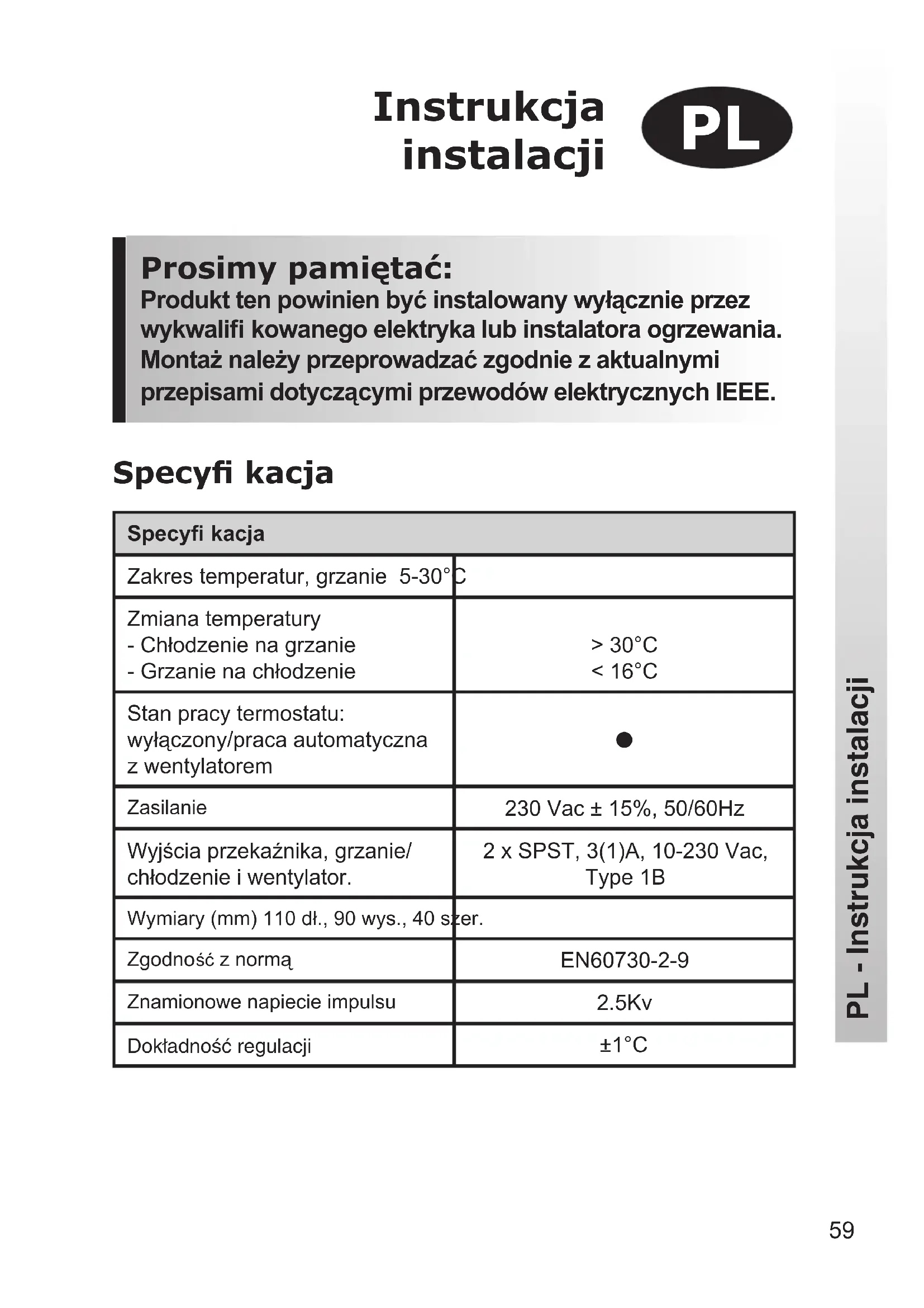 RESET59 Prosimy pamiętać: Produkt ten powinien być instalowany wyłącznie przez wykwalifi kowanego elektryka lub instalatora ogrzewania. Montaż należy przeprowadzać zgodnie z aktualnymi przepisami dotyczącymi przewodów elektrycznych IEEE. Instrukcja instalacji