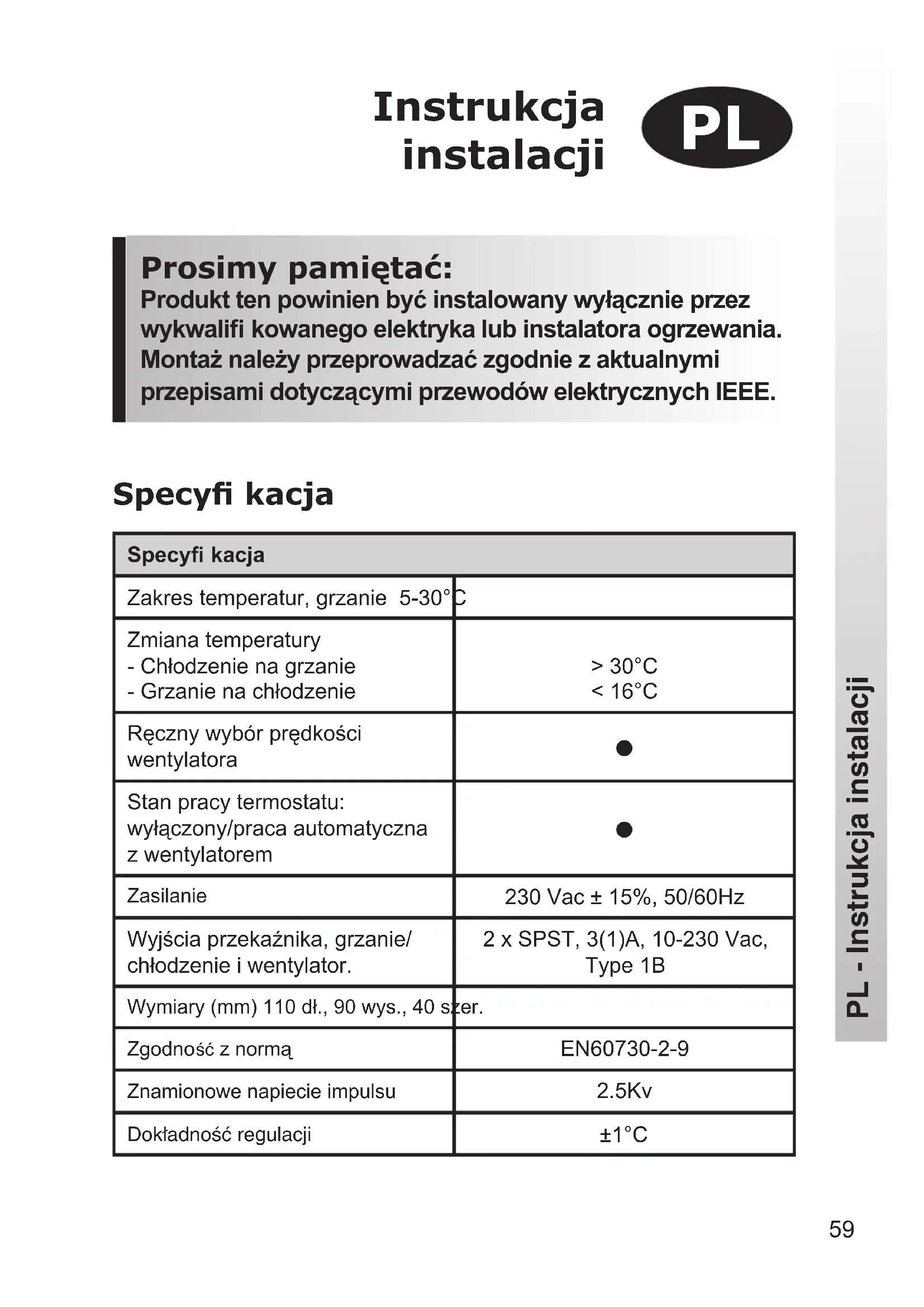 PL - Instrukcja instalacji Specyfi kacjaZakres temperatur, grzanie 5-30°CZmiana temperatury- Chłodzenie na grzanie- Grzanie na chłodzenie> 30°C< 16°CRęczny wybór prędkości wentylatora Stan pracy termostatu: wyłączony/praca automatyczna z wentylatorem Zasilanie230 Vac ± 15%, 50/60HzWyjścia przekaźnika, grzanie/ chłodzenie i wentylator.2 x SPST, 3(1)A, 10-230 Vac, Type 1BWymiary (mm) 110 dł., 90 wys., 40 szer.Zgodność z normąEN60730-2-9Znamionowe napiecie impulsu2.5KvDokładność regulacji ±1°C Specyfi kacja60 PL - Instrukcja instalacji Opis urządzenia Termostat ten zaprojektowany jest do stosowania w systemach wyposażonych w klimakonwektory wentylatorowe obsługiwane przez 2-rurowy centralny system zmiany. Termostat ten steruje działaniem napędzanego silnikiem elektrycznym zaworu, który podczas okresów grzania otwiera się, gdy wymagane jest ciepło, a podczas okresów chłodzenia otwiera się, gdy wymagane jest chłodzenie. Zmiana z grzania na chłodzenie dokonywana jest automatycznie przez pomiar temperatury rury przepływowej. Jeśli temperatura przepływu przekroczy 30º C, termostat ten działa jak termostat grzewczy, a jeśli temperatura jest niższa niż 16º C, wtedy termostat działa jak termostat chłodzący. Uwaga: Jest niezmiernie ważne, aby obwód, w którym umieszczony jest czujnik, nie był zamknięty i aby woda krążyła przez rurę cały czas. Może to wymagać zastosowania zaworu obejściowego pomiędzy systemem przepływu i powrotu na końcu każdego obwodu. Instalacja Najpierw usuń pokrywę z tylnej części urządzenia