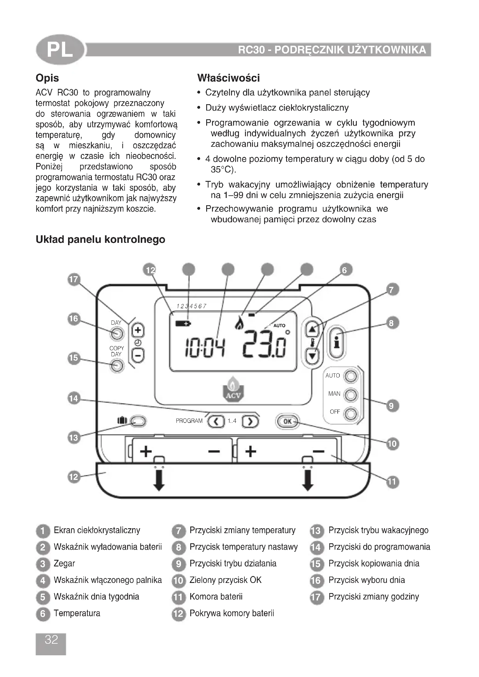 ACV RC30 to programowalny termostat pokojowy przyznaczony do sterOWANIA ogrzewaniem w taki sposob, aby utrzmywać komfortowa temperature, gdy domownicy sa w mieszkaniu, i oszczedzać energia w czasie ich nieobecnosci. Ponizej przystawiono sposob programOWANIA termostatu RC30 orazivitieskystania w taki sposob, aby zapewnic uzytkownikom jak najwyzszy komfort przy najnizszym koscie.