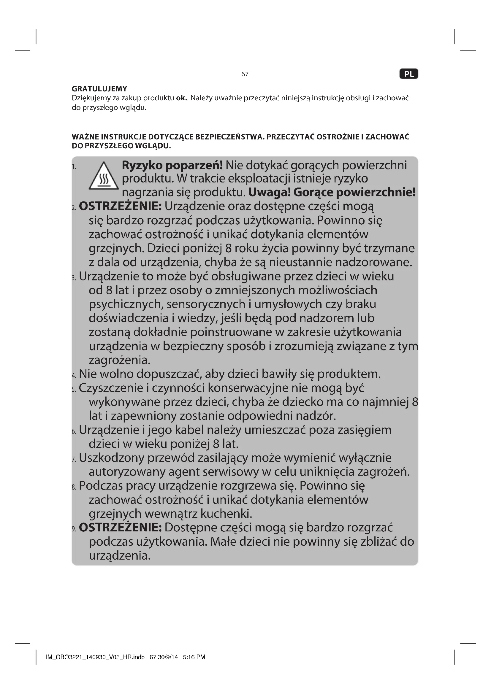podczas użytkowania. Małe dzieci nie powinny się zbliżać do urządzenia. IM_OBO3221_140930_V03_HR.indb 67 30/9/14 5:16 PM68