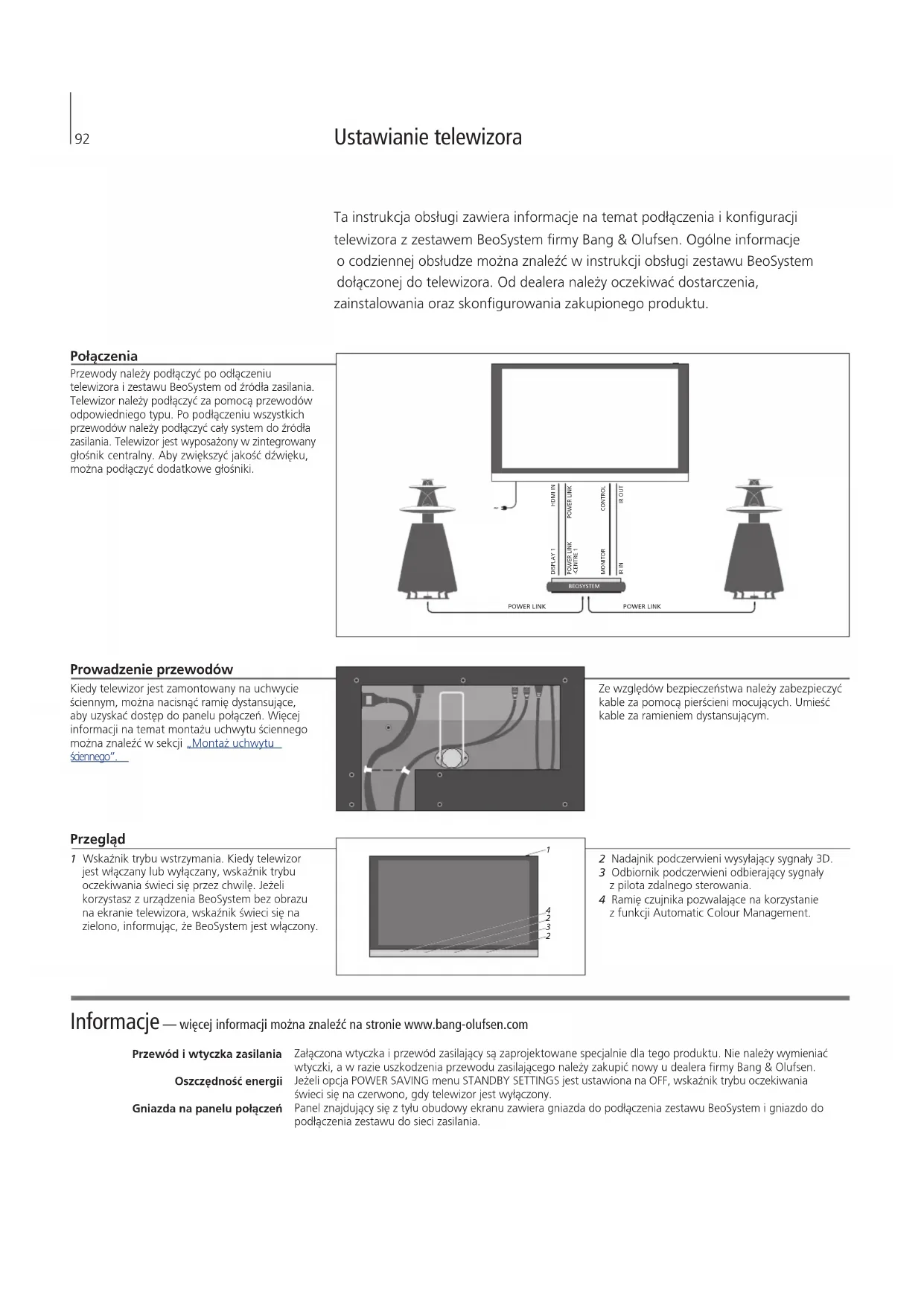4Informacje — więcej informacji można znaleźć na stronie www.bang-olufsen.com Przewód i wtyczka zasilania Oszczędność energii Gniazda na panelu połączeń Załączona wtyczka i przewód zasilający są zaprojektowane specjalnie dla tego produktu. Nie należy wymieniać wtyczki, a w razie uszkodzenia przewodu zasilającego należy zakupić nowy u dealera rmy Bang &Olufsen. Jeżeli opcja POWER SAVING menu STANDBY SETTINGS jest ustawiona na OFF, wskaźnik trybu oczekiwania świeci się na czerwono, gdy telewizor jest wyłączony. Panel znajdujący się z tyłu obudowy ekranu zawiera gniazda do podłączenia zestawu BeoSystem i gniazdo do podłączenia zestawu do sieci zasilania. Ustawianie telewizora Ta instrukcja obsługi zawiera informacje na temat podłączenia i konguracji telewizora z zestawem BeoSystem rmy Bang & Olufsen. Ogólne informacje o codziennej obsłudze można znaleźć w instrukcji obsługi zestawu BeoSystem dołączonej do telewizora. Od dealera należy oczekiwać dostarczenia, zainstalowania oraz skongurowania zakupionego produktu. Prowadzenie przewodów Kiedy telewizor jest zamontowany na uchwycie ściennym, można nacisnąć ramię dystansujące, aby uzyskać dostęp do panelu połączeń. Więcej informacji na temat montażu uchwytu ściennego można znaleźć w sekcji „Montaż uchwytu ściennego”. Połączenia Przewody należy podłączyć po odłączeniu telewizora i zestawu BeoSystem od źródła zasilania. Telewizor należy podłączyć za pomocą przewodów odpowiedniego typu. Po podłączeniu wszystkich przewodów należy podłączyć cały system do źródła zasilania. Telewizor jest wyposażony w zintegrowany głośnik centralny. Aby zwiększyć jakość dźwięku, można podłączyć dodatkowe głośniki. Przegląd 1 Wskaźnik trybu wstrzymania. Kiedy telewizor jest włączany lub wyłączany, wskaźnik trybu oczekiwania świeci się przez chwilę. Jeżeli korzystasz z urządzenia BeoSystem bez obrazu na ekranie telewizora, wskaźnik świeci się na zielono, informując, że BeoSystem jest włączony. 2 Nadajnik podczerwieni wysyłający sygnały 3D. 3 Odbiornik podczerwieni odbierający sygnały z pilota zdalnego sterowania. 4 Ramię czujnika pozwalające na korzystanie z funkcji Automatic Colour Management. Ze względów bezpieczeństwa należy zabezpieczyć kable za pomocą pierścieni mocujących. Umieść kable za ramieniem dystansującym.