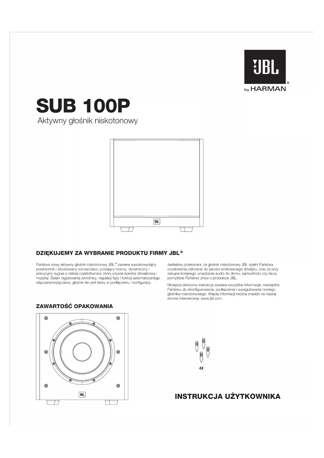 Państwa nowy aktywny głośnik niskotonowy JBL zawiera wysokowydajny przetwornik i wbudowany wzmacniacz, podający mocny, dynamiczny i precyzyjny sygnał o niskiej częstotliwości, który ożywia ścieżkę dźwiękową i muzykę. Dzięki regulowanej zwrotnicy, regulacji fazy i funkcji automatycznego włączania/wyłączania, głośnik ten jest łatwy w podłączeniu i konfiguracji.Jesteśmy przekonani, że głośnik niskotonowy JBL spełni Państwa oczekiwania odnośnie do jakości emitowanego dźwięku, oraz że przy zakupie kolejnego urządzanie audio do domu, samochodu czy biura, pomyślicie Państwo znów o produkcie JBL.Niniejsza skrócona instrukcja zawiera wszystkie informacje, niezbędne Państwu do skonfigurowania, podłączenia i wyregulowania nowego głośnika niskotonowego. Więcej informacji można znaleźć na naszej stronie internetowej: www.jbl.com. Aktywny głośnik niskotonowy DZIĘKUJEMY ZA WYBRANIE PRODUKTU FIRMY JBL