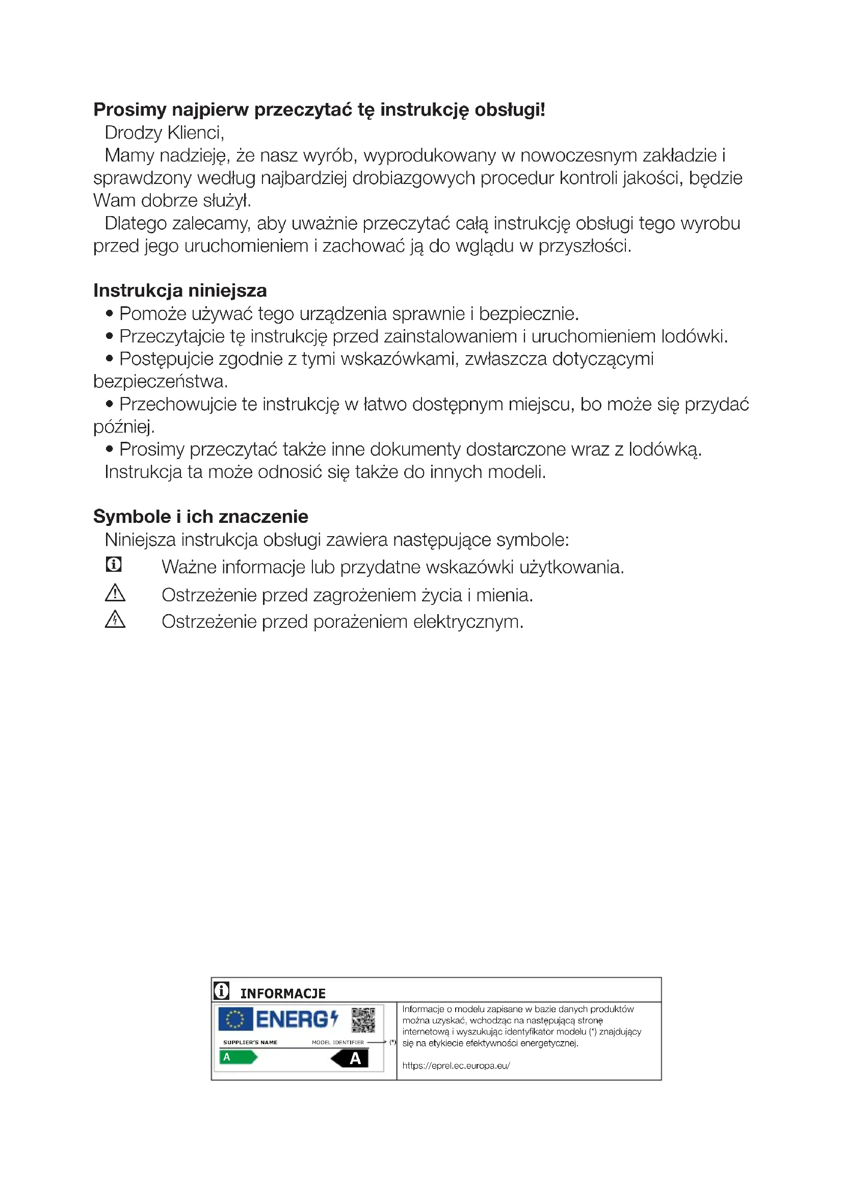 - Prosimy przeczytać także inne dokumenty dostarczone wraz z lodówką. Instrukcja ta może odnosić się także do innych modeli. Symbole i ich znaczenie Niniejsza instrukcja obsługi zawiera następujące symbole: C Ważne informacje lub przydatne wskazówki użytkowania. A Ostrzeżenie przed zagrożeniem życia i mienia. B Ostrzeżenie przed porażeniem elektrycznym. INFORMACJE