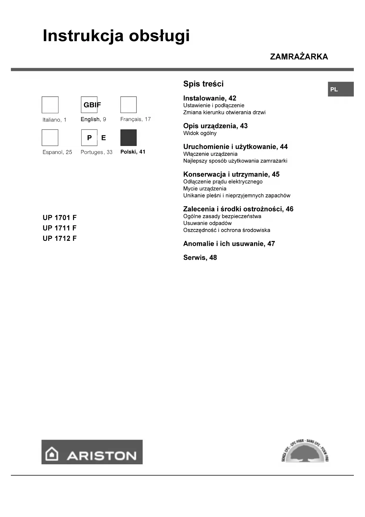 modelo número de sériePL ZAMRA¯ARKA Instrukcja obs³ugi Spis treci Instalowanie, 42 Ustawienie i pod³¹czenie Zmiana kierunku otwierania drzwi Opis urz¹dzenia, 43 Widok ogólny Uruchomienie i u¿ytkowanie, 44 W³¹czenie urz¹dzenia Najlepszy sposób u¿ytkowania zamra¿arki Konserwacja i utrzymanie, 45 Od³¹czenie pr¹du elektrycznego Mycie urz¹dzenia Unikanie pleni i nieprzyjemnych zapachów Zalecenia i rodki ostro¿noci, 46 Ogólne zasady bezpieczeñstwa Usuwanie odpadów Oszczêdnoæ i ochrona rodowiska Anomalie i ich usuwanie, 47 Serwis, 48 UP 1701 F UP 1711 F UP 1712 F Italiano, 1 Français, 17 English, 9 GBI F Portuges , 33 Polski, 41 Espanol, 25 P PLE42