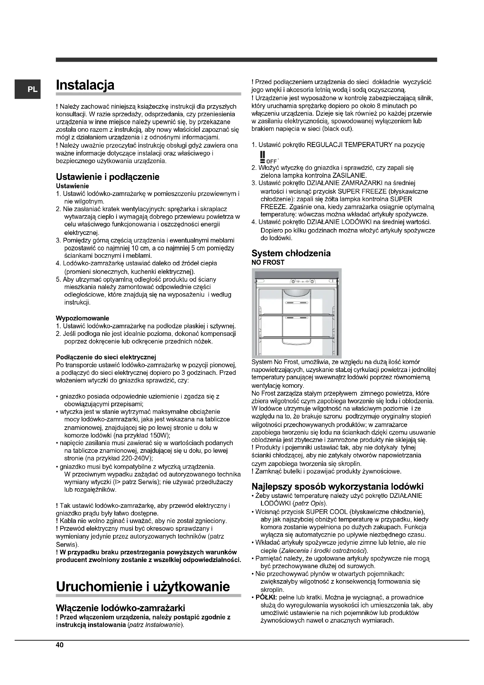 Dopiero po kilku godzinach można włożyć artykuły spożywcze do lodówki. System chłodzenia NO FROST System No Frost, umożliwia, ze względu na dużą ilość komór napowietrzających, uzyskanie staŁej cyrkulacji powietrza i jednolitej temperatury panującej wwewnątrz lodówki poprzez równomierną wentylację komory. No Frost zarządza stałym przepływem zimnego powietrza, które zbiera wilgotność czym zapobiega tworzenie się lodu i oblodzenia. W lodówce utrzymuje wilgotność na właściwym poziomie i ze względu na to, że brakuje szronu podtrzymuje oryginalny stopień wilgotności przechowywanych produktów; w zamrażarce zapobiega tworzeniu się lodu na ściankach dzięki czemu usuwanie oblodzenia jest zbyteczne i zamrożone produkty nie sklejają się. ! Produkty i pojemniki ustawiać tak, aby nie dotykały tylnej ścianki chłodzącej, aby nie zatykały otworów napowietrzania czym zapobiega tworzenia się skroplin. ! Zamknąć butelki i pozawijać produkty żywnościowe. Najlepszy sposób wykorzystania lodówki