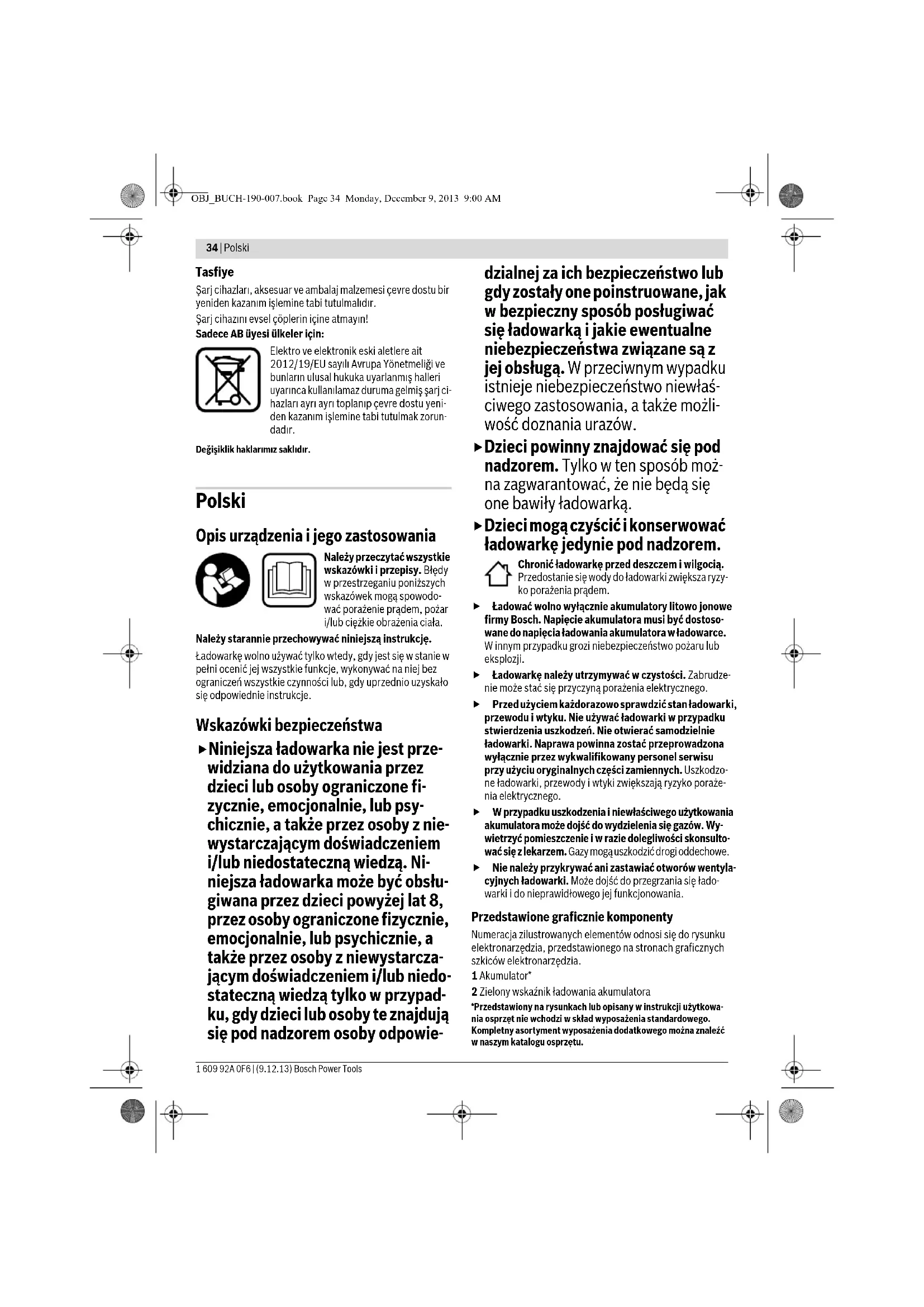 Denizli Tel.: 0258 2620666 Bulut Elektrik İstasyon Cad. No: 52/B Devlet Tiyatrosu Karşısı Elazığ Tel.: 0424 2183559 Körfez Elektrik Sanayi Çarşısı 770 Sok. No: 71 Erzincan Tel.: 0446 2230959 Ege Elektrik İnönü Bulvaro No: 135 Muğla Makasarası Fethiye Fethiye Tel.: 0252 6145701 Değer İş Bobinaj İsmetpaşa Mah. İlk Belediye Başkan Cad. 5/C Şahinbey Gaziantep Tel.: 0342 2316432 Çözüm Bobinaj İsmetpaşa Mah. Eski Şahinbey Belediyesi altı Cad. No: 3/C Gaziantep Tel.: 0342 2319500 Onarım Bobinaj Raifpaşa Cad. No: 67 İskenderun Hatay Tel.: 0326 6137546 Günşah Otomotiv Beylikdüzü Sanayi Sit. No: 210 Beylikdüzü İstanbul Tel.: 0212 8720066 Aygem 10021 Sok. No: 11 AOSB Çiğli İzmir Tel.: 0232 3768074 Sezmen Bobinaj Ege İş Merkezi 1201/4 Sok. No: 4/B Yenişehir İzmir Tel.: 0232 4571465 Ankaralı Elektrik Eski Sanayi Bölgesi 3. Cad. No: 43 Kayseri Tel.: 0352 3364216 Asal Bobinaj Eski Sanayi Sitesi Barbaros Cad. No: 24 Samsun Tel.: 0362 2289090 Üstündağ Elektrikli Aletler Nusretiye Mah. Boyacılar Aralığı No: 9 Tekirdağ Tel.: 0282 6512884 Akü şarj göstergesi 2 yanmıyor Şarj cihazının şebeke fişi takı- lı değil veya doğru takılı değil Şebeke fişini tam olarak prize takın Priz, şebeke kablosu veya şarj cihazı arızalı Şebeke gerilimini kontrol edin, gerekiyorsa şarj cihazını Bosch elektrikli el aletleri için yetkili bir serviste kontrol etti- rin Nedeni Giderilmesi OBJ_BUCH-190-007.book Page 33 Monday, December 9, 2013 9:00 AM34 | Polski 1 609 92A 0F6 | (9.12.13) Bosch Power Tools Tasfiye Şarj cihazları, aksesuar ve ambalaj malzemesi çevre dostu bir yeniden kazanım işlemine tabi tutulmalıdır. Şarj cihazını evsel çöplerin içine atmayın! Sadece AB üyesi ülkeler için: Elektro ve elektronik eski aletlere ait 2012/19/EU sayılı Avrupa Yönetmeliği ve bunların ulusal hukuka uyarlanmış halleri uyarınca kullanılamaz duruma gelmiş şarj ci- hazları ayrı ayrı toplanıp çevre dostu yeni- den kazanım işlemine tabi tutulmak zorun- dadır. Değişiklik haklarımız saklıdır. Polski Opis urządzenia i jego zastosowania Należy przeczytać wszystkie wskazówki i przepisy. Błędy w przestrzeganiu poniższych wskazówek mogą spowodo- wać porażenie prądem, pożar i/lub ciężkie obrażenia ciała. Należy starannie przechowywać niniejszą instrukcję. Ładowarkę wolno używać tylko wtedy, gdy jest się w stanie w pełni ocenić jej wszystkie funkcje, wykonywać na niej bez ograniczeń wszystkie czynności lub, gdy uprzednio uzyskało się odpowiednie instrukcje. Wskazówki bezpieczeństwa Niniejsza ładowarka nie jest prze- widziana do użytkowania przez dzieci lub osoby ograniczone fi- zycznie, emocjonalnie, lub psy- chicznie, a także przez osoby z nie- wystarczającym doświadczeniem i/lub niedostateczną wiedzą. Ni- niejsza ładowarka może być obsłu- giwana przez dzieci powyżej lat 8, przez osoby ograniczone fizycznie, emocjonalnie, lub psychicznie, a także przez osoby z niewystarcza- jącym doświadczeniem i/lub niedo- stateczną wiedzą tylko w przypad- ku, gdy dzieci lub osoby te znajdują się pod nadzorem osoby odpowie- dzialnej za ich bezpieczeństwo lub gdy zostały one poinstruowane, jak w bezpieczny sposób posługiwać się ładowarką i jakie ewentualne niebezpieczeństwa związane są z jej obsługą. W przeciwnym wypadku istnieje niebezpieczeństwo niewłaś- ciwego zastosowania, a także możli- wość doznania urazów. Dzieci powinny znajdować się pod nadzorem. Tylko w ten sposób moż- na zagwarantować, że nie będą się one bawiły ładowarką. Dzieci mogą czyścić i konserwować ładowarkę jedynie pod nadzorem. Chronić ładowarkę przed deszczem i wilgocią. Przedostanie się wody do ładowarki zwiększa ryzy- ko porażenia prądem. Ładować wolno wyłącznie akumulatory litowo jonowe firmy Bosch. Napięcie akumulatora musi być dostoso- wane do napięcia ładowania akumulatora w ładowarce. W innym przypadku grozi niebezpieczeństwo pożaru lub eksplozji. Ładowarkę należy utrzymywać w czystości. Zabrudze- nie może stać się przyczyną porażenia elektrycznego. Przed użyciem każdorazowo sprawdzić stan ładowarki, przewodu i wtyku. Nie używać ładowarki w przypadku stwierdzenia uszkodzeń. Nie otwierać samodzielnie ładowarki. Naprawa powinna zostać przeprowadzona wyłącznie przez wykwalifikowany personel serwisu przy użyciu oryginalnych części zamiennych. Uszkodzo- ne ładowarki, przewody i wtyki zwiększają ryzyko poraże- nia elektrycznego. W przypadku uszkodzenia i niewłaściwego użytkowania akumulatora może dojść do wydzielenia się gazów. Wy- wietrzyć pomieszczenie i w razie dolegliwości skonsulto- wać się z lekarzem. Gazy mogą uszkodzić drogi oddechowe. Nie należy przykrywać ani zastawiać otworów wentyla- cyjnych ładowarki. Może dojść do przegrzania się łado- warki i do nieprawidłowego jej funkcjonowania. Przedstawione graficznie komponenty Numeracja zilustrowanych elementów odnosi się do rysunku elektronarzędzia, przedstawionego na stronach graficznych szkiców elektronarzędzia. 1 Akumulator* 2 Zielony wskaźnik ładowania akumulatora *Przedstawiony na rysunkach lub opisany w instrukcji użytkowa-nia osprzęt nie wchodzi w skład wyposażenia standardowego. Kompletny asortyment wyposażenia dodatkowego można znaleźć w naszym katalogu osprzętu.OBJ_BUCH-190-007.book Page 34 Monday, December 9, 2013 9:00 AMPolski | 35 Bosch Power Tools 1 609 92A 0F6 | (9.12.13) Dane techniczne Praca Uruchamianie Zwrócić uwagę na napięcie w sieci! Napięcie źródła prą- du musi zgadzać się z danymi na tabliczce znamionowej ła- dowarki. Ładowarki o napięciu 230 V można podłączyć do sieci 220 V. Ładowanie Ładowanie rozpoczyna się w momencie włożenia wtyczki ła- dowarki do gniazdka sieciowego i wstawienia akumulatora 1 względnie elektronarzędzia z zamocowanym akumulatorem 1 do ładowarki. Podczas procesu łado